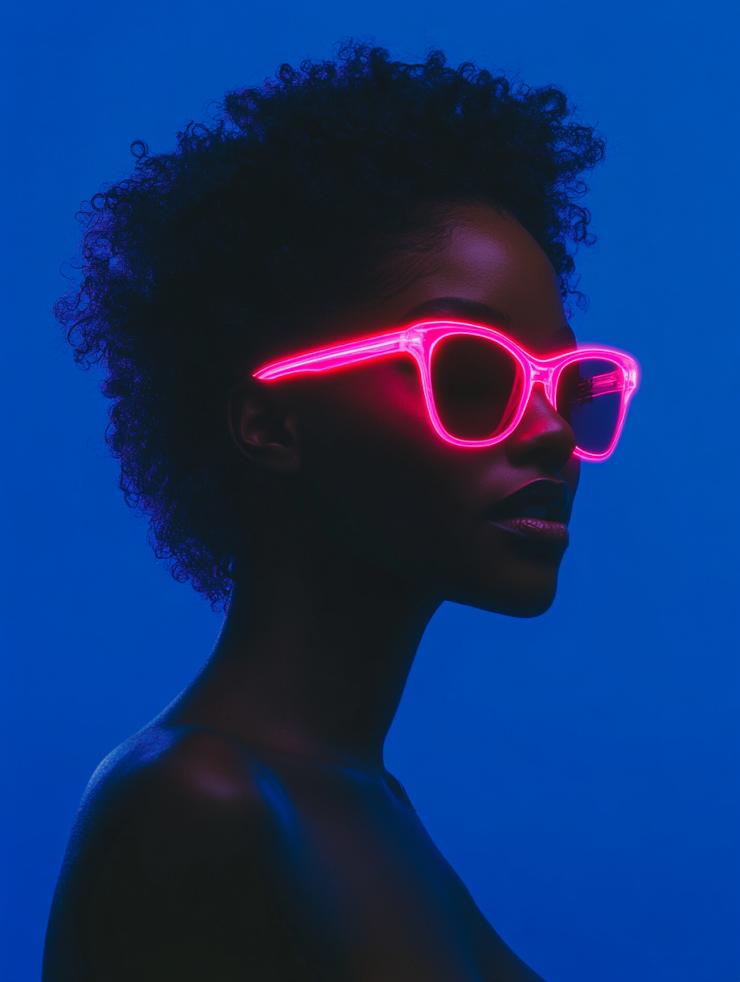 A bold portrait of a woman in glowing neon pink sunglasses against a deep blue background, blending futuristic vibes with striking contrast.