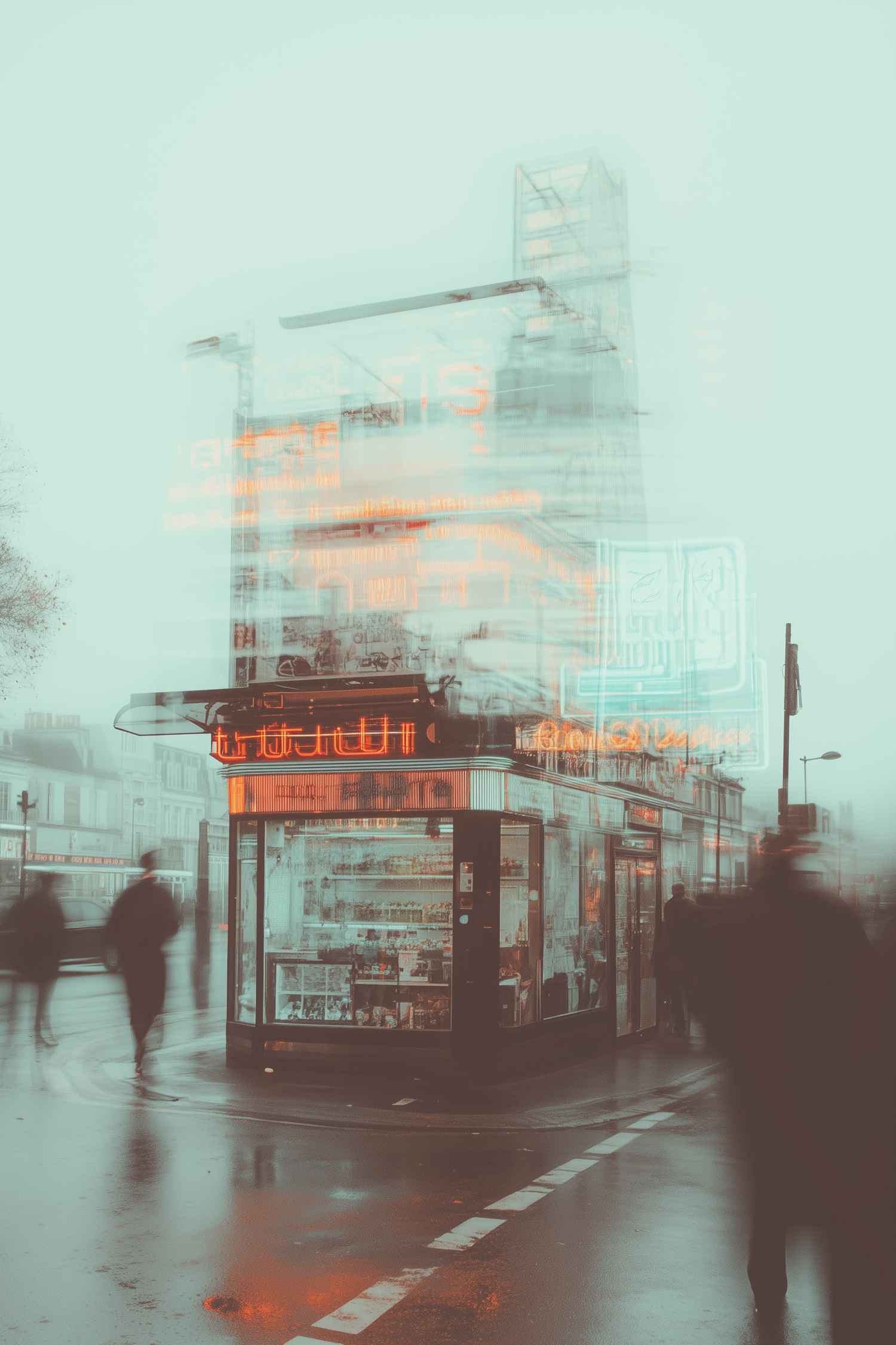A neon-lit kiosk on a misty street corner, surrounded by blurred pedestrians and glowing reflections on wet pavement.