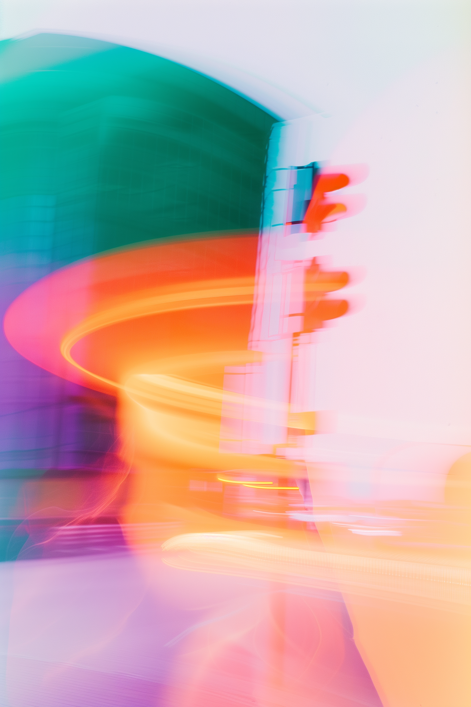 Abstract neon light trails with a traffic light and blurred urban background, creating a dynamic and colorful composition.