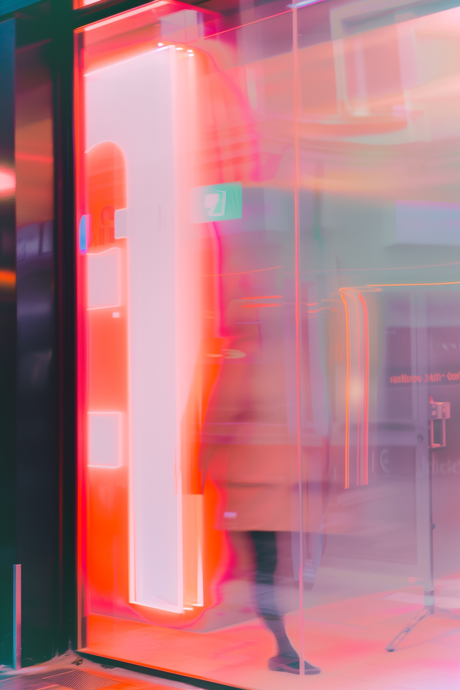 Blurred figure walking through neon-lit glass door with glowing number '1' and vibrant pink-orange hues creating a futuristic vibe.