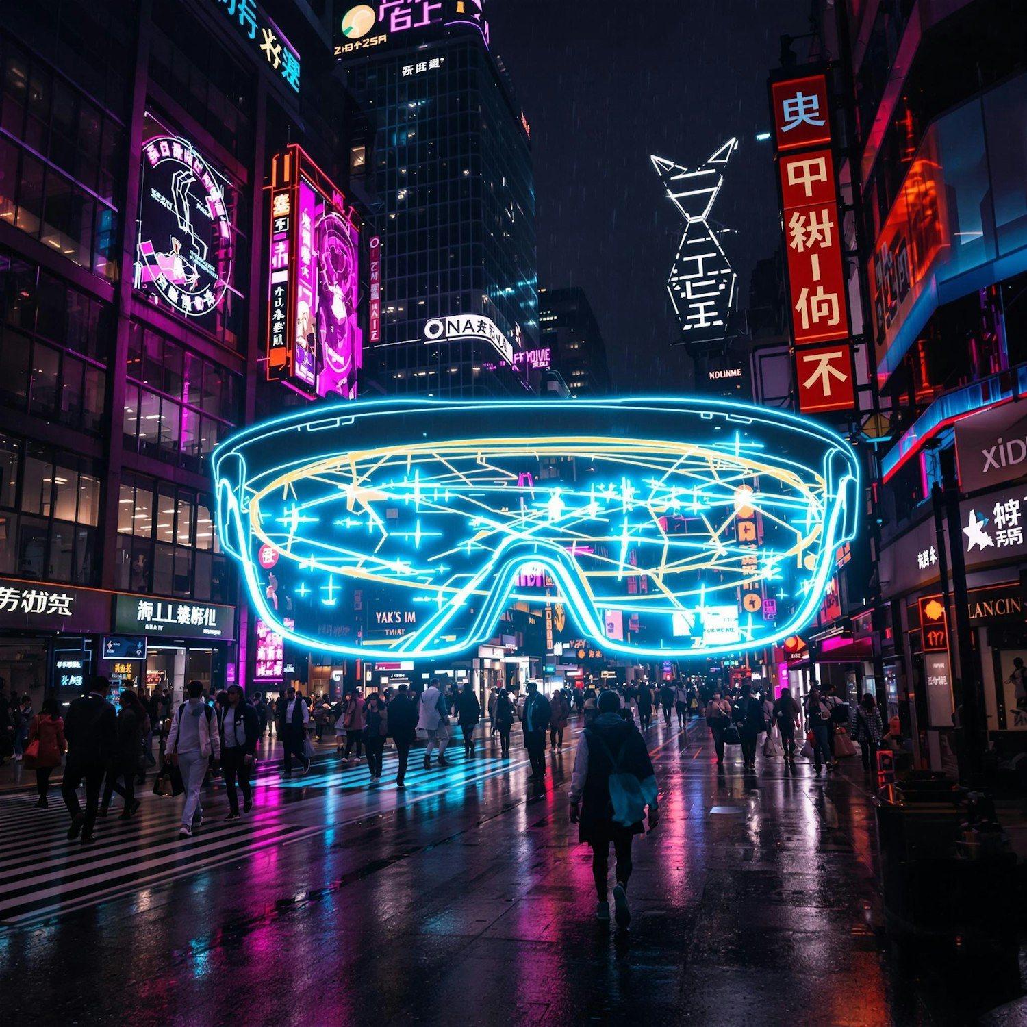 Futuristic city street at night with neon lights, a giant glowing glasses installation, and reflections on wet pavement.