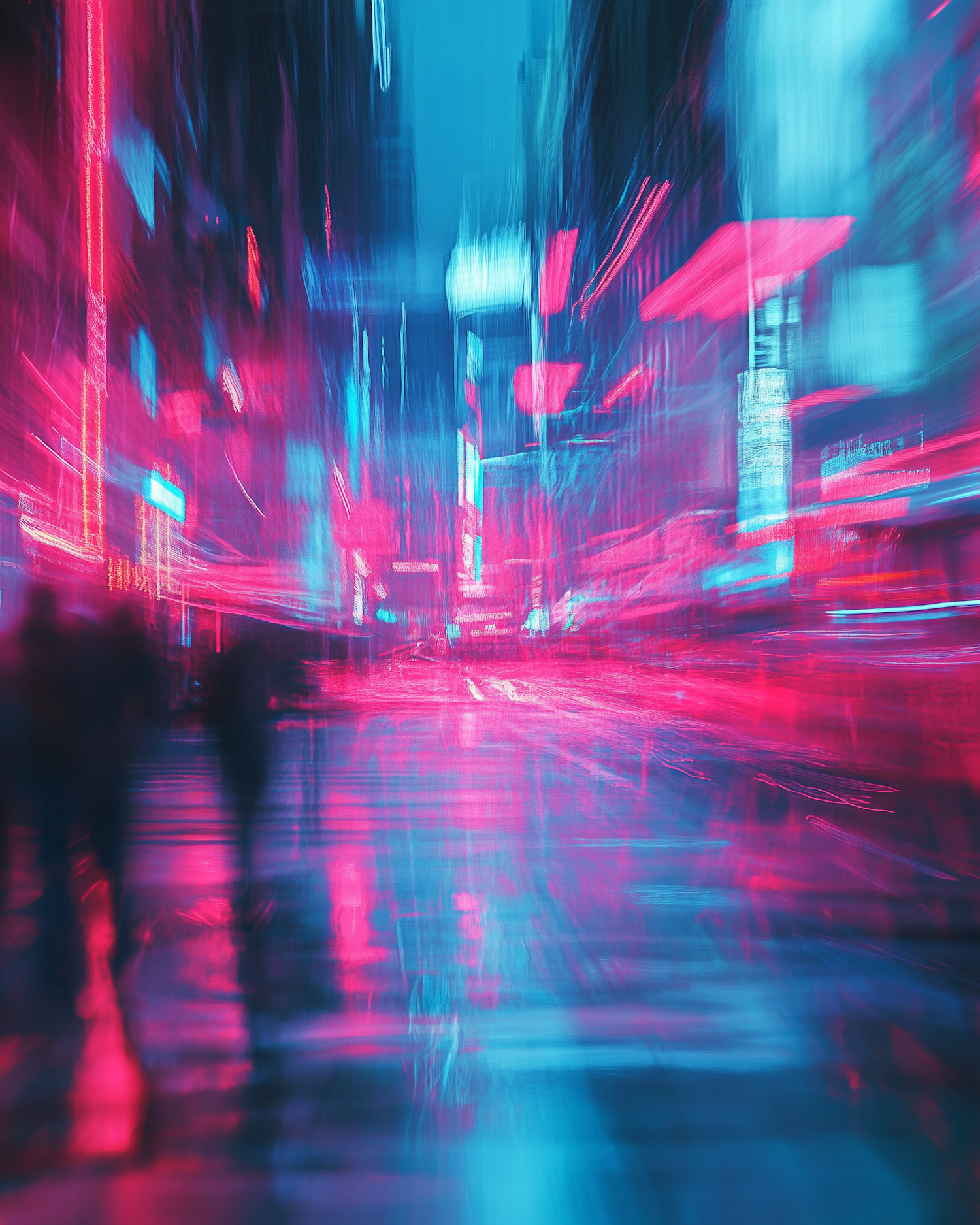 Blurred neon cityscape with pink and blue lights, creating a dynamic, futuristic atmosphere with reflections on wet pavement.
