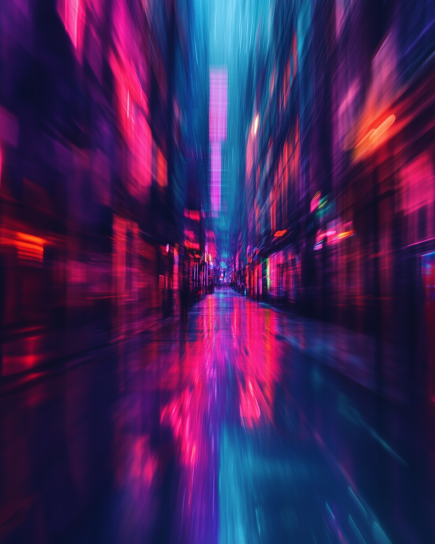 Blurred city street with neon lights reflecting on wet pavement, creating a vibrant cyberpunk atmosphere.