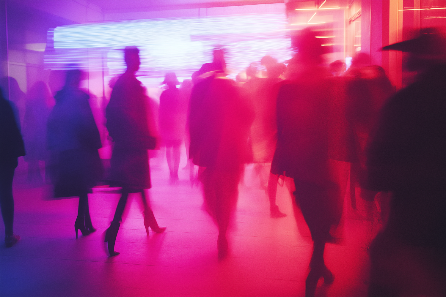 Blurred silhouettes of people walking under vibrant pink and purple neon lights, creating a surreal and futuristic urban vibe.