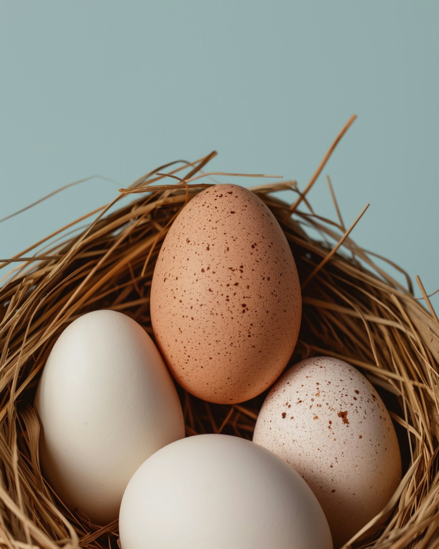 A rustic nest with four eggs—two white and two speckled—set against a soft blue background. Perfect for nature or Easter themes.