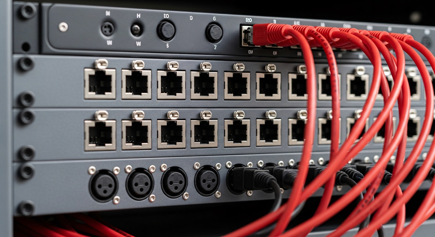 Close-up of a network rack with Ethernet ports, XLR connectors, and red cables, showcasing a professional and organized setup.