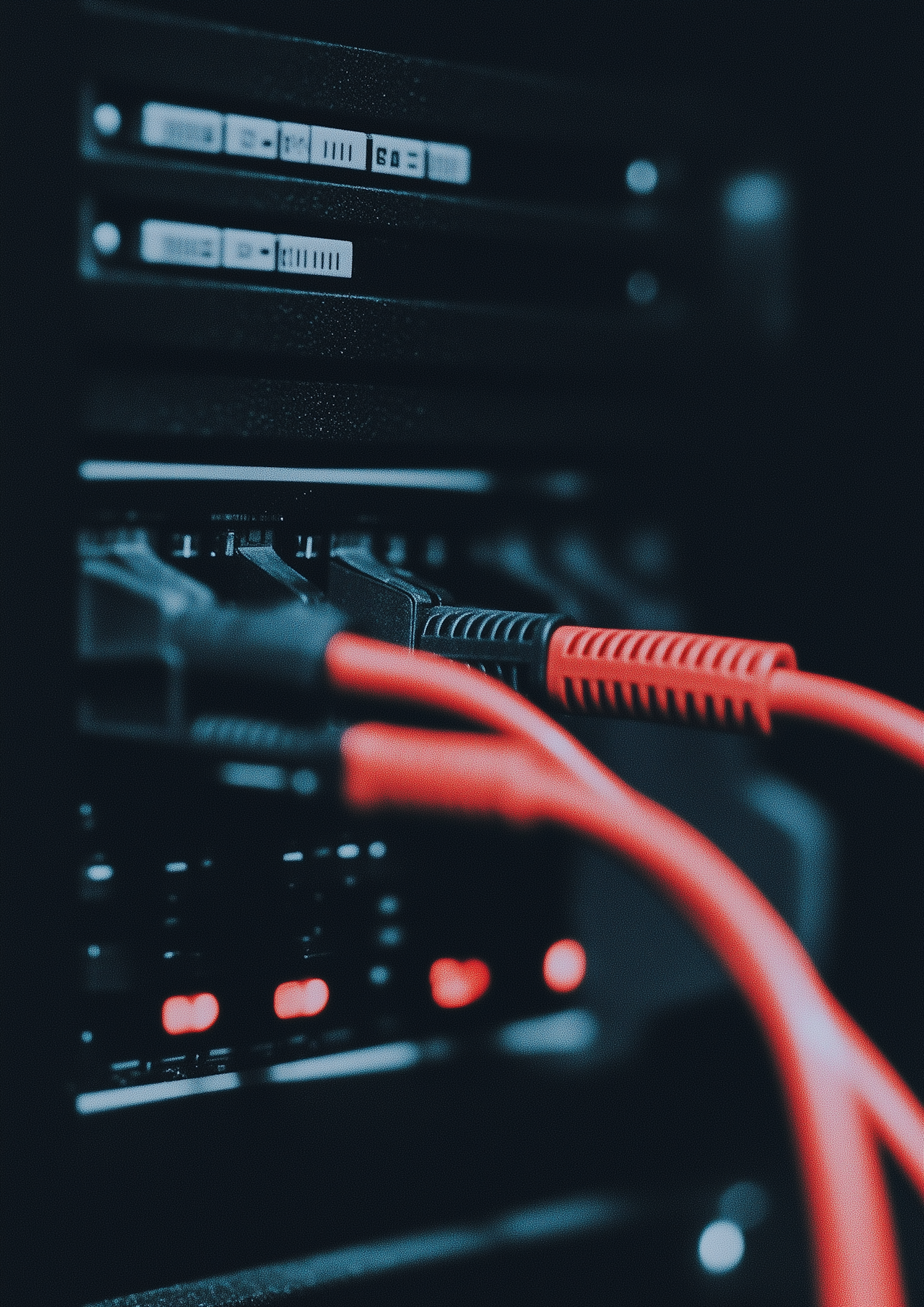 Close-up of red Ethernet cables connected to a server, with glowing indicator lights and a sleek, modern tech setup in dim lighting.