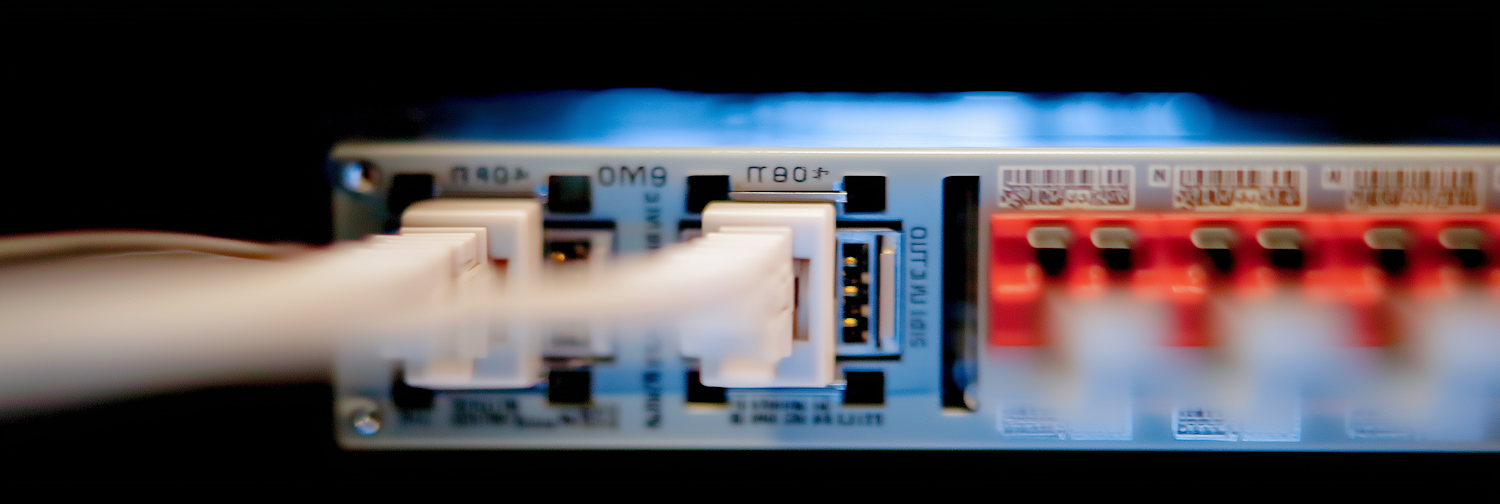 Close-up of a network switch with white Ethernet cables plugged in and red ports visible, showcasing modern connectivity technology.