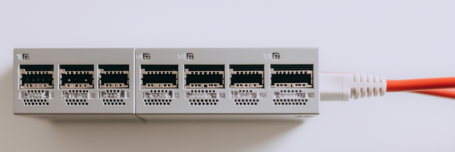 Close-up of a network switch with eight Ethernet ports and an orange cable plugged in, set against a clean white background.