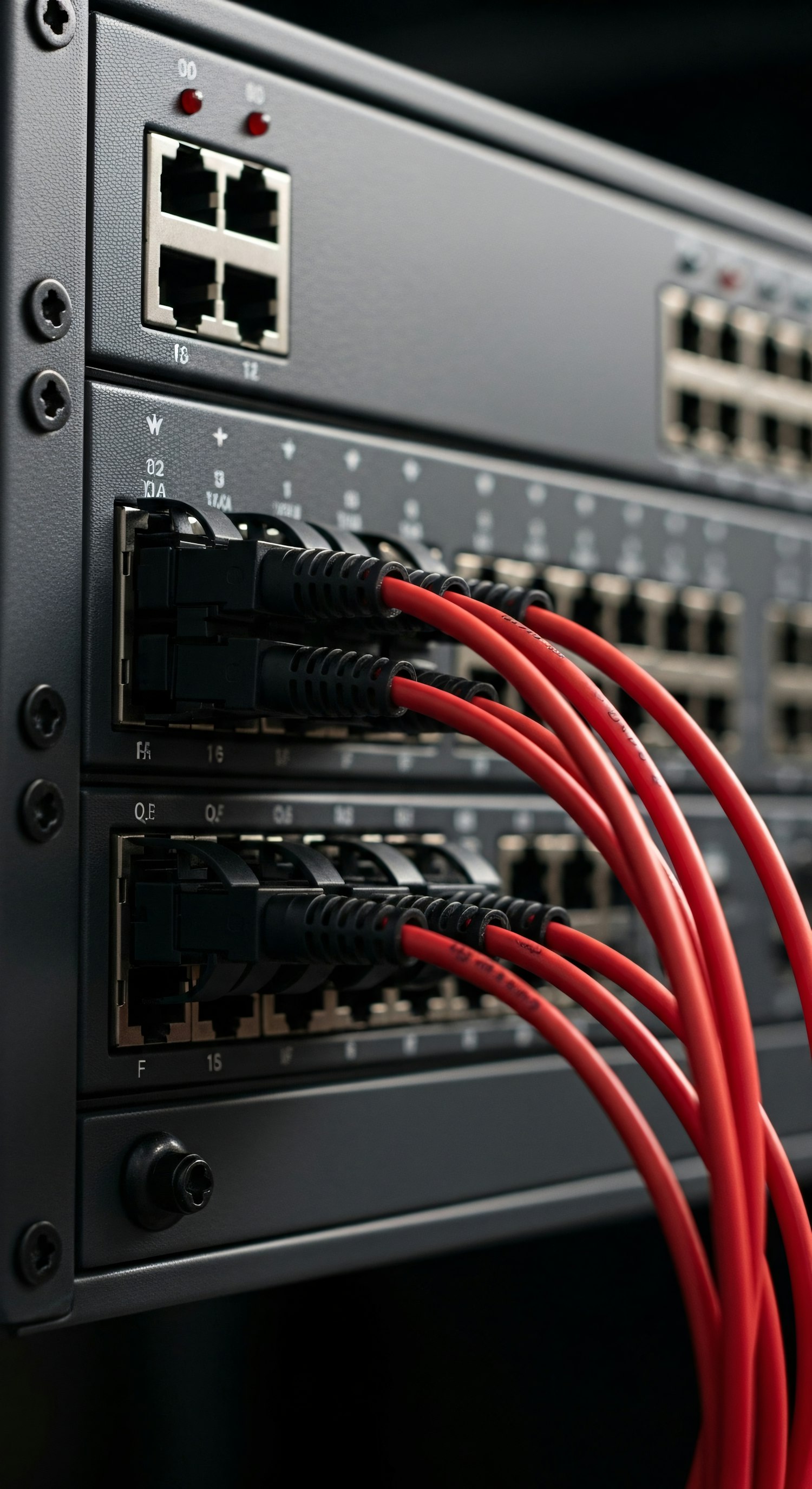 Close-up of a network switch with red Ethernet cables connected, showcasing a professional and organized IT setup.