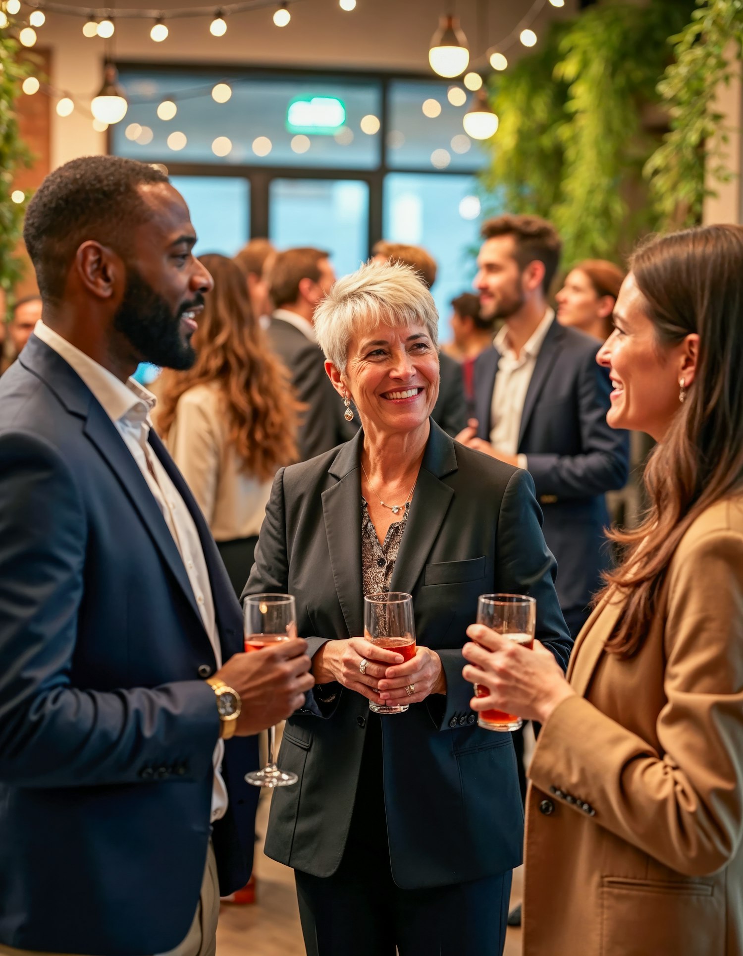 Three people in formal attire enjoy a lively social gathering with drinks, surrounded by string lights and greenery.