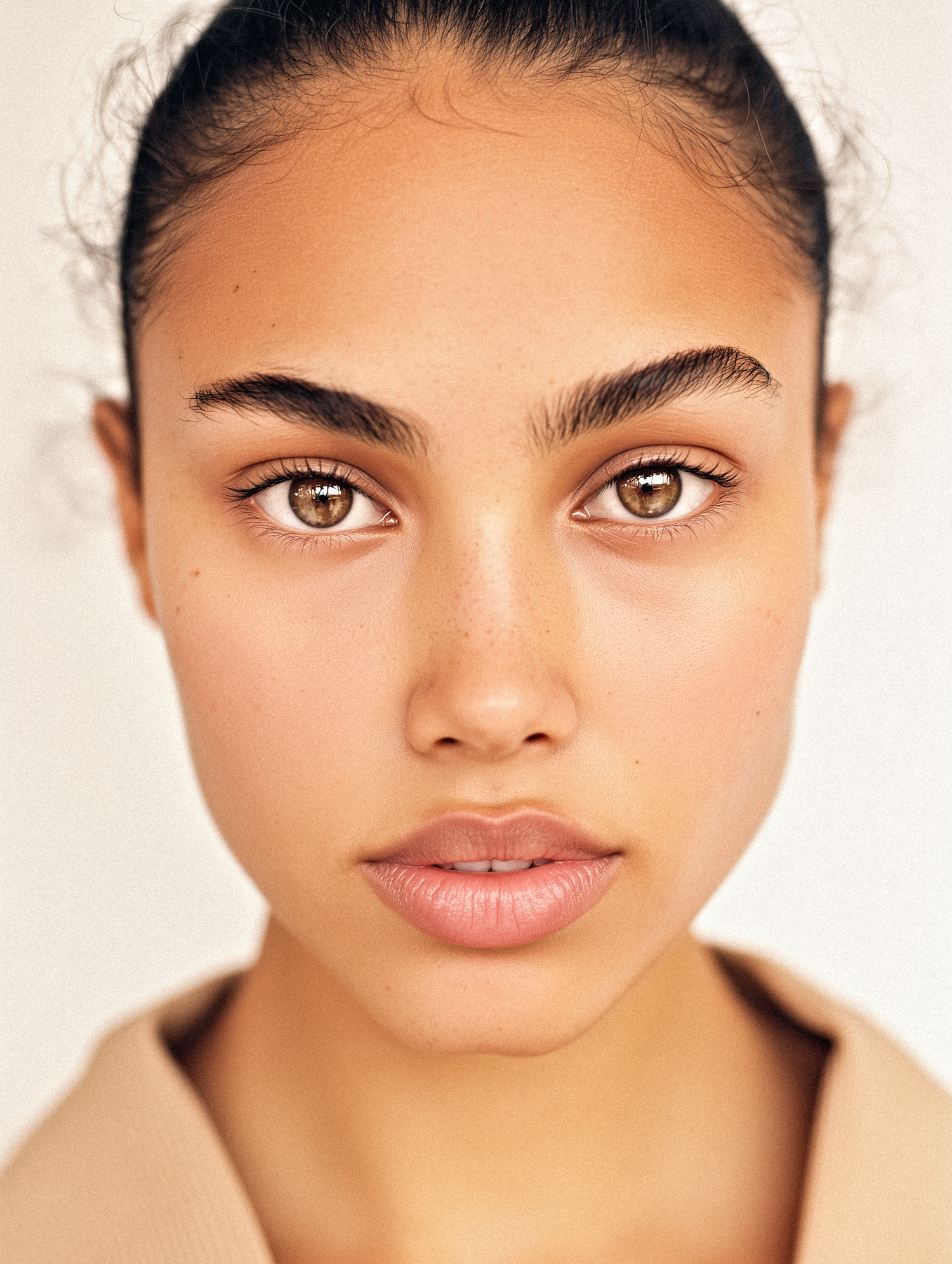 Close-up portrait of a person with smooth skin, light brown eyes, and natural features, set against a softly lit neutral background.