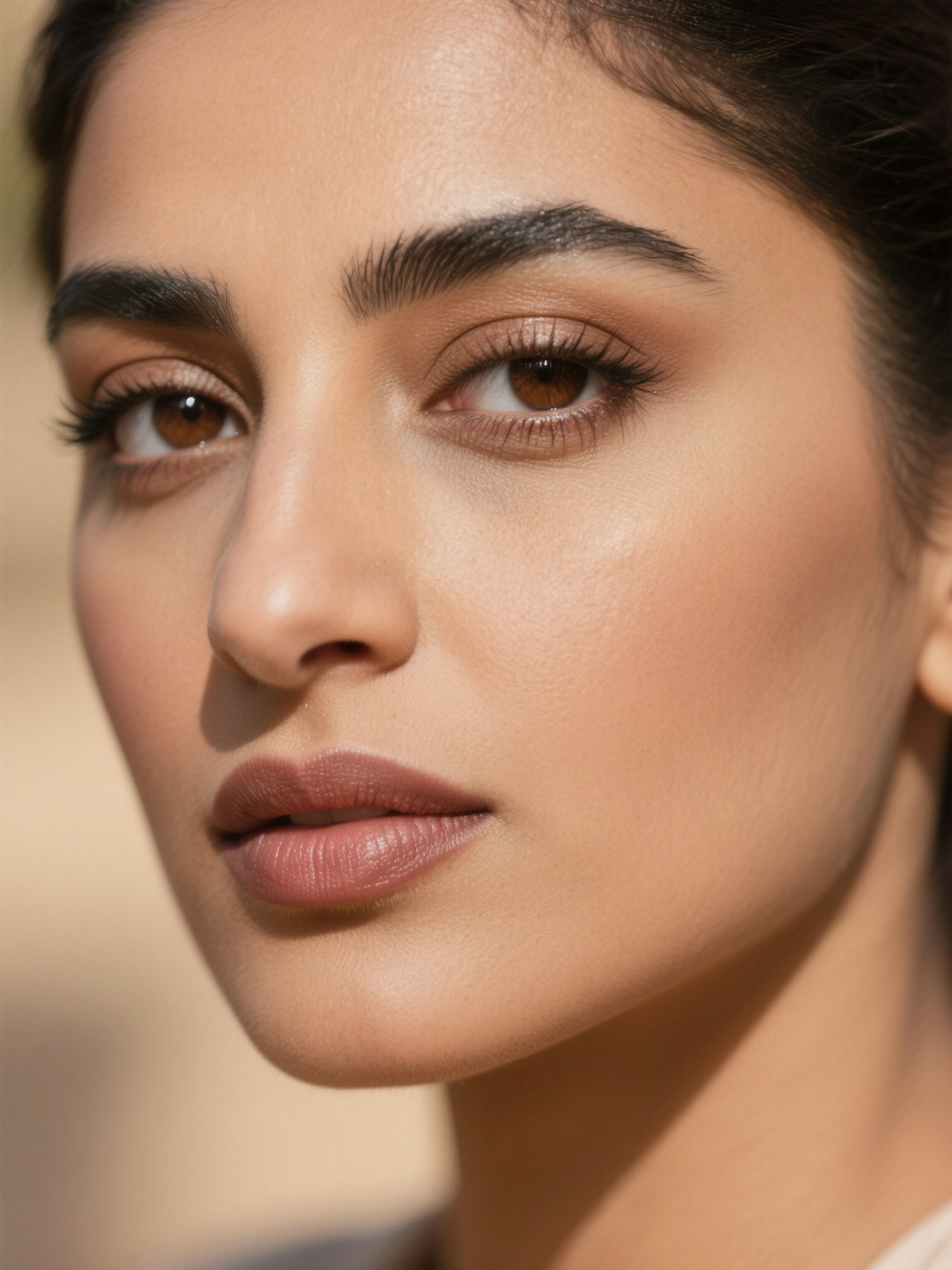 Close-up of a person with radiant skin, brown eyes, and natural makeup, showcasing a serene and confident expression.