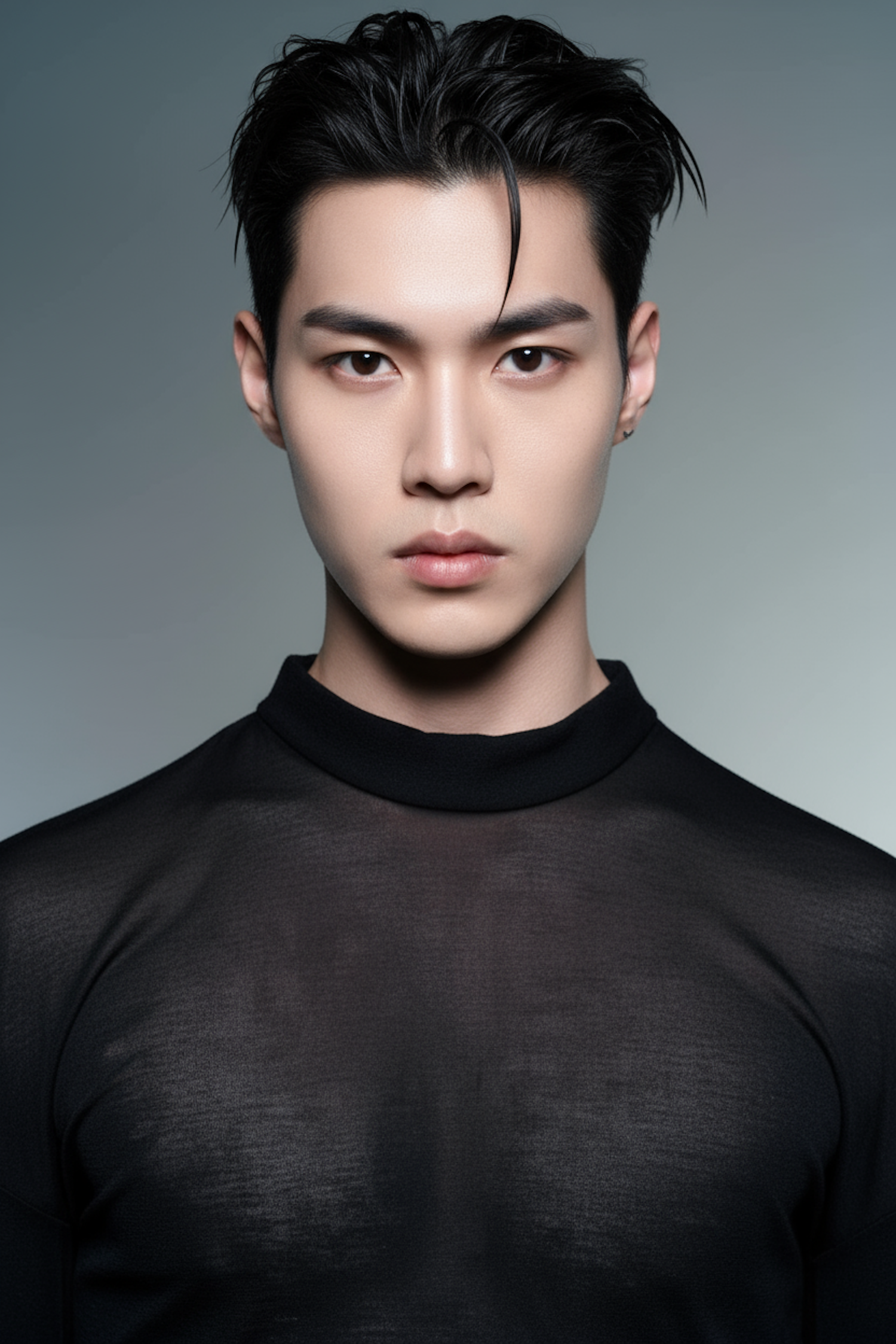 A portrait of a person with styled black hair, wearing a black semi-transparent top, set against a light gray gradient background.