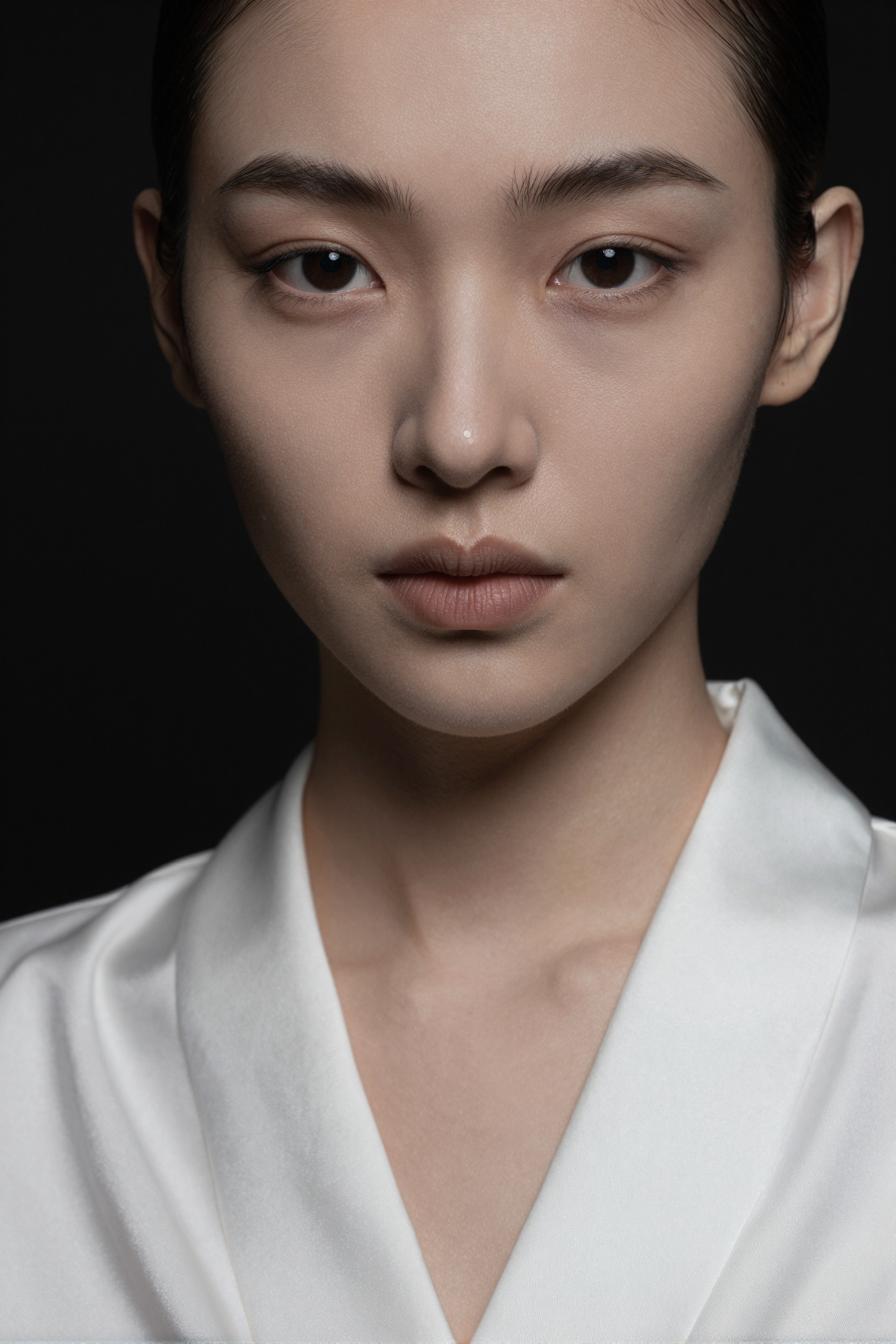 Close-up portrait of a person with a neutral expression, wearing a white garment against a dark background.