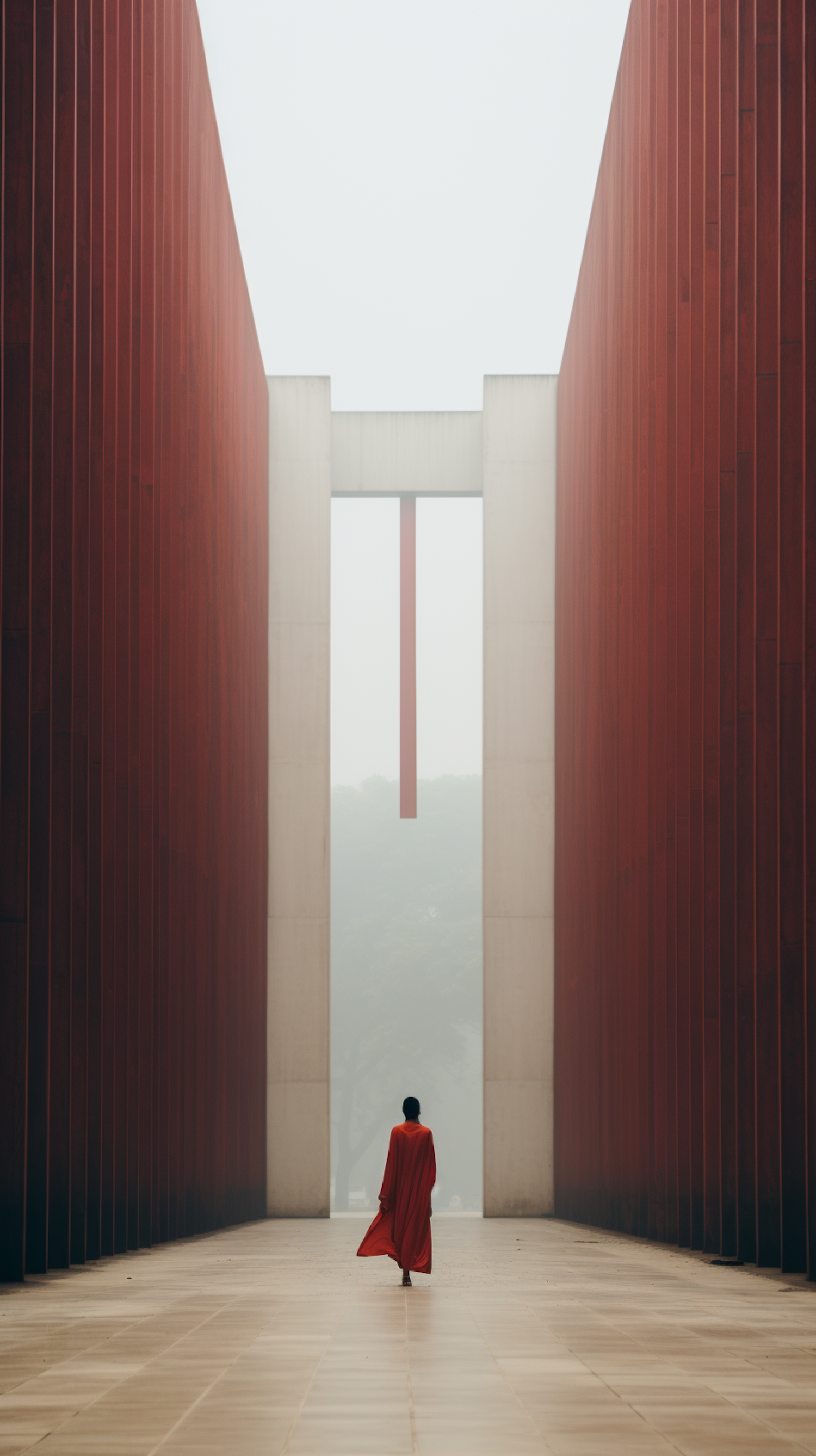 A lone figure in a red robe walks through a misty corridor with towering red walls, creating a serene and contemplative scene.