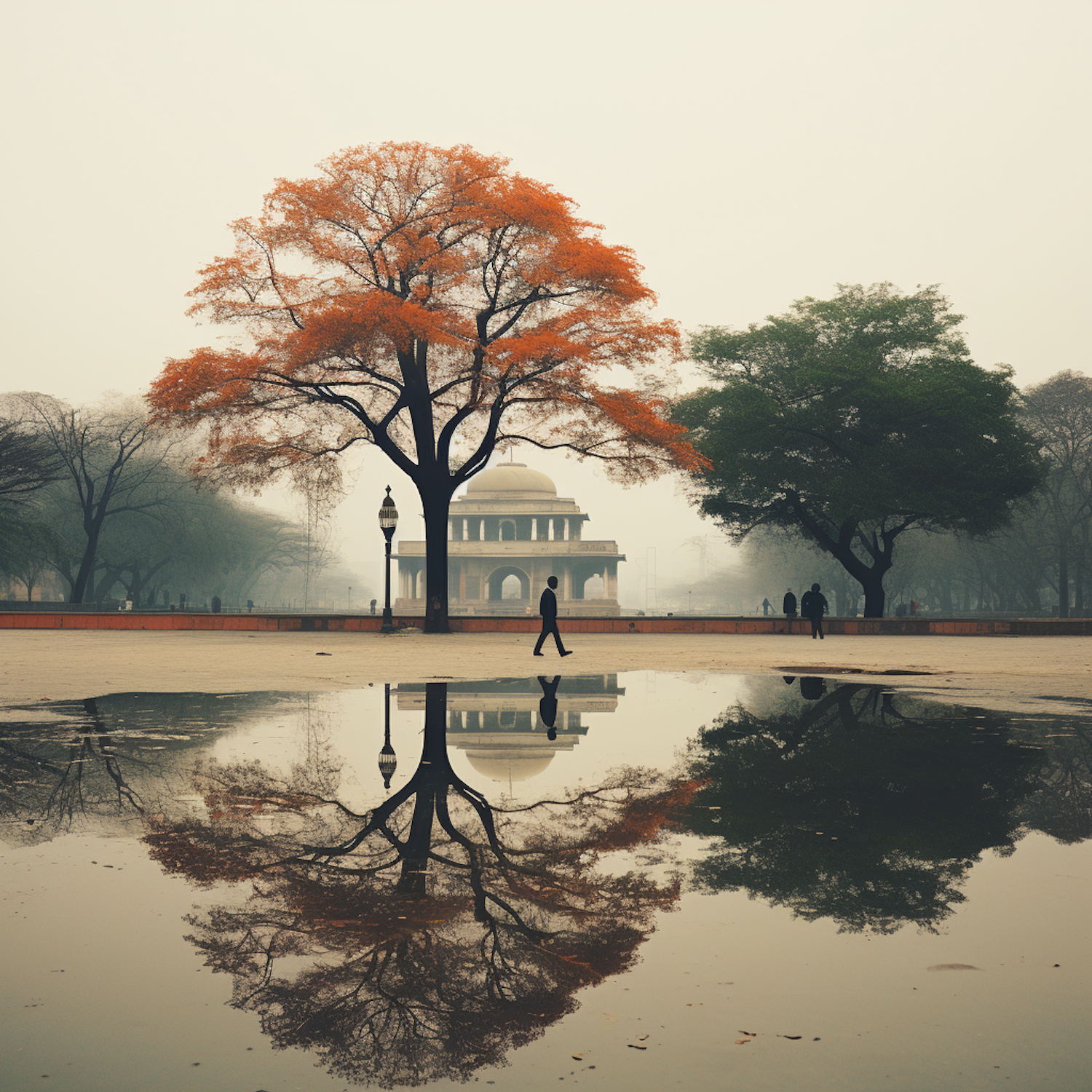 A tranquil scene with an orange tree reflected in water, a domed monument in the background, and misty surroundings.
