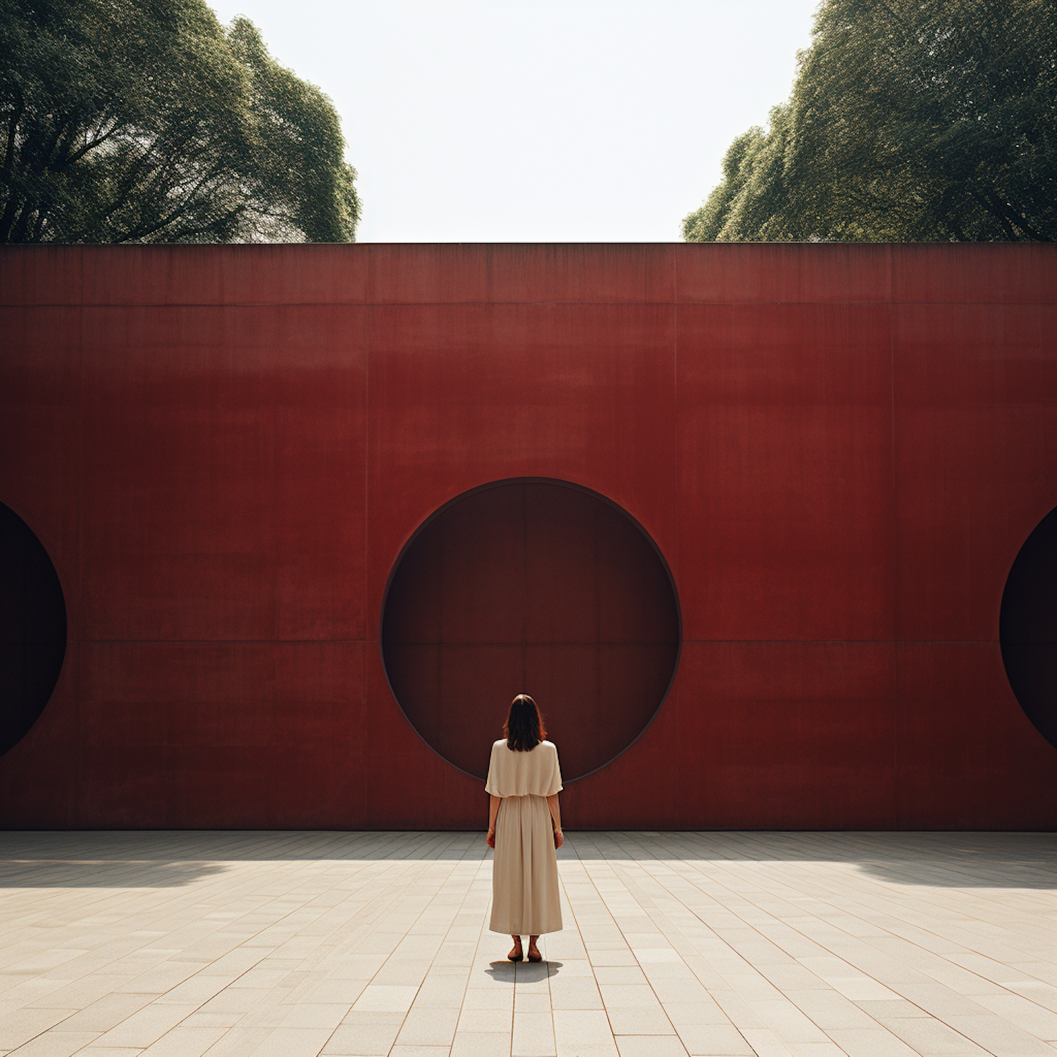 Woman in a light dress stands before a bold red wall with circular cutouts, creating a striking minimalist scene.