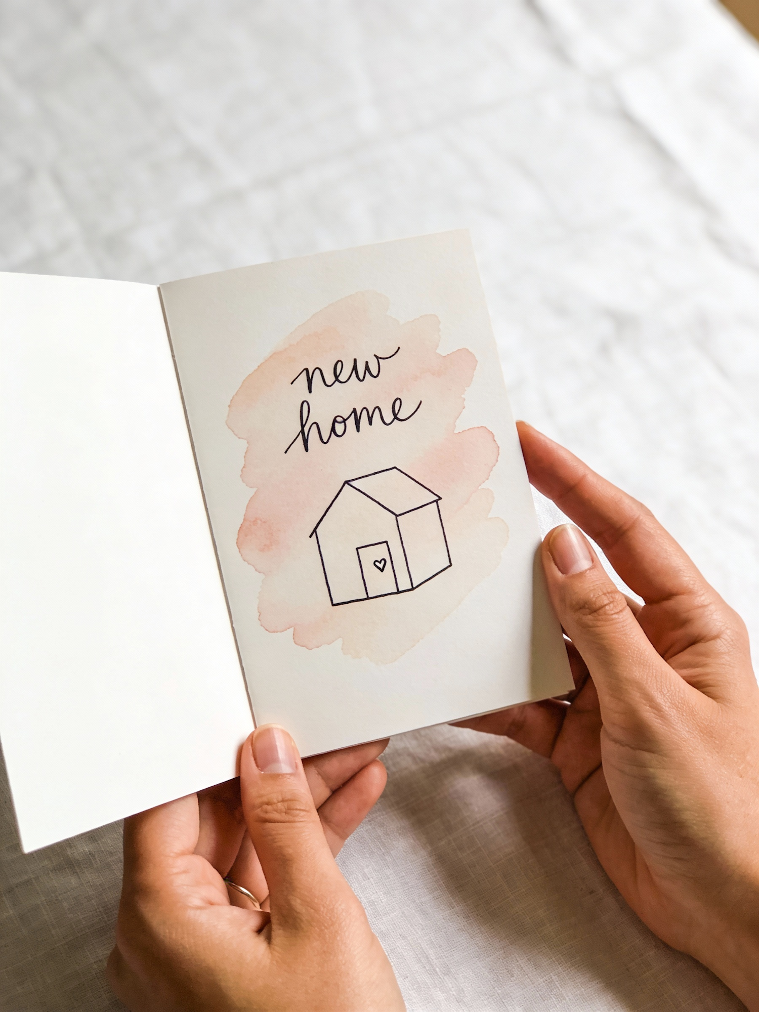 a hand-drawn card with the text "new home" and a simple line art illustration of a tiny house with a little heart on the door, pastel watercolor wash, holding the card in one's hands, white linen tablecloth background, slightly open, soft daylight, realistic photo, no extra text, no logos, no watermark