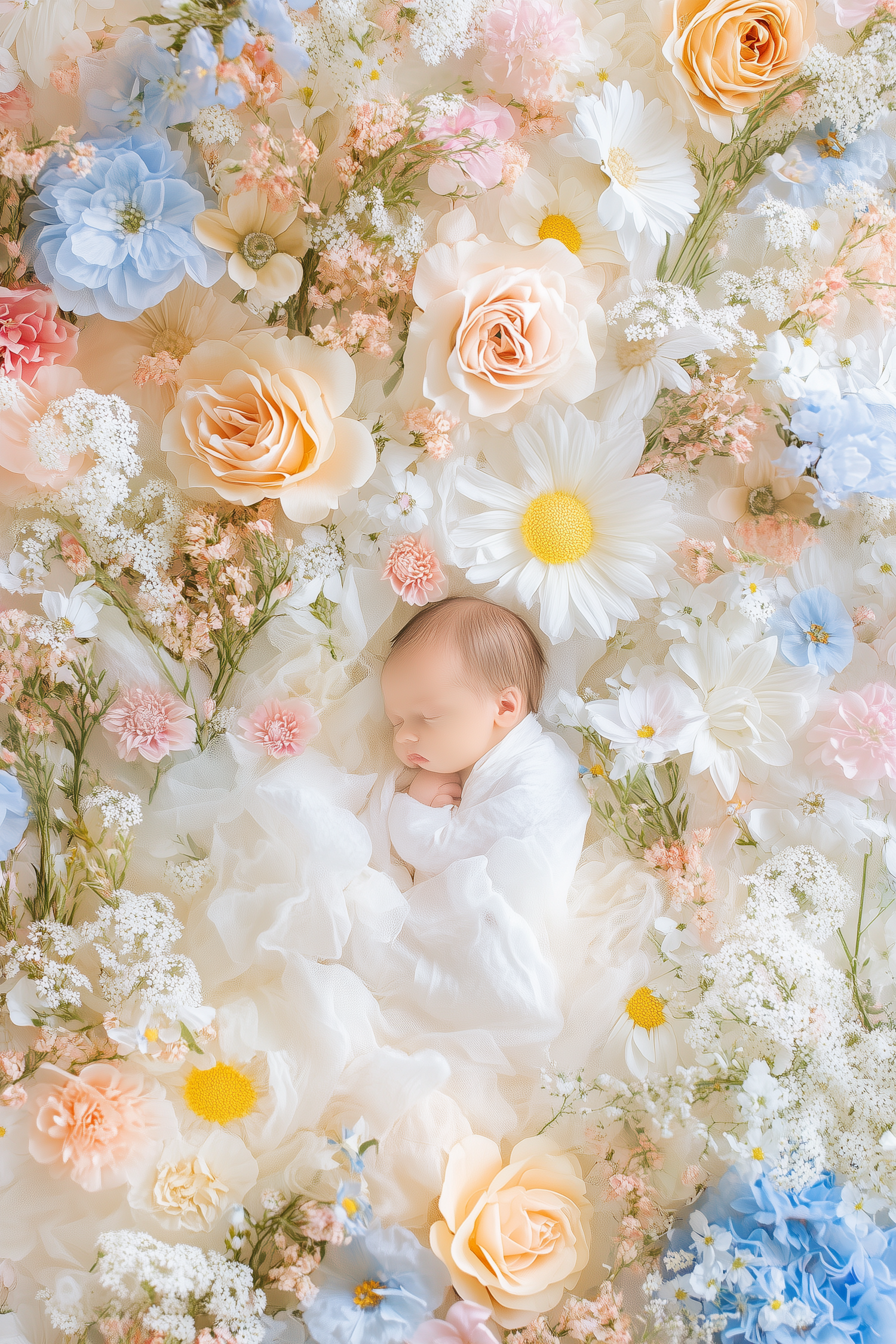 Newborn baby peacefully sleeping among vibrant flowers, wrapped in a soft white blanket. A serene and harmonious floral scene.