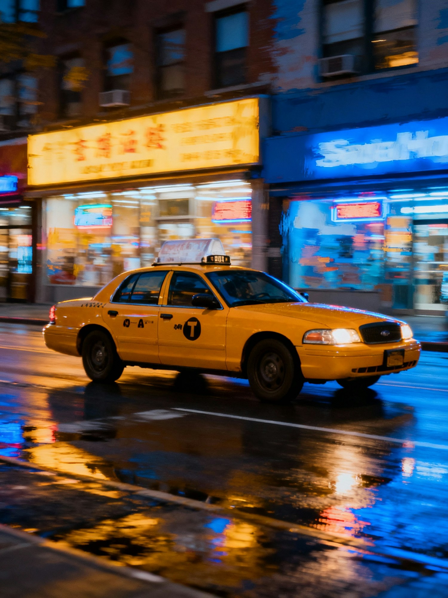 A yellow taxi drives through a wet city street at night, reflecting vibrant neon lights from nearby storefronts.
