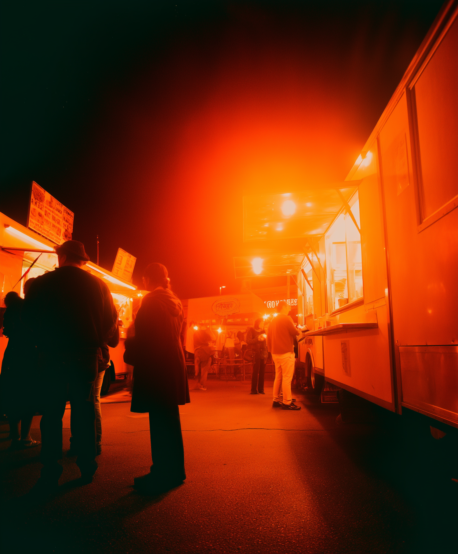 Nighttime food truck scene with glowing orange lights, people in line, and a vibrant atmosphere against a dark sky.