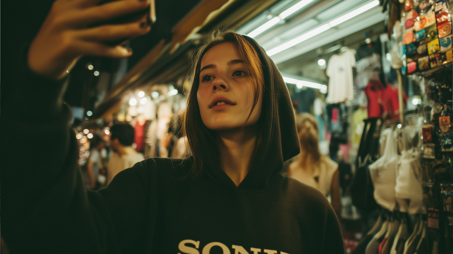 A young woman in a black hoodie takes a selfie in a vibrant, illuminated night market filled with colorful stalls and bustling activity.
