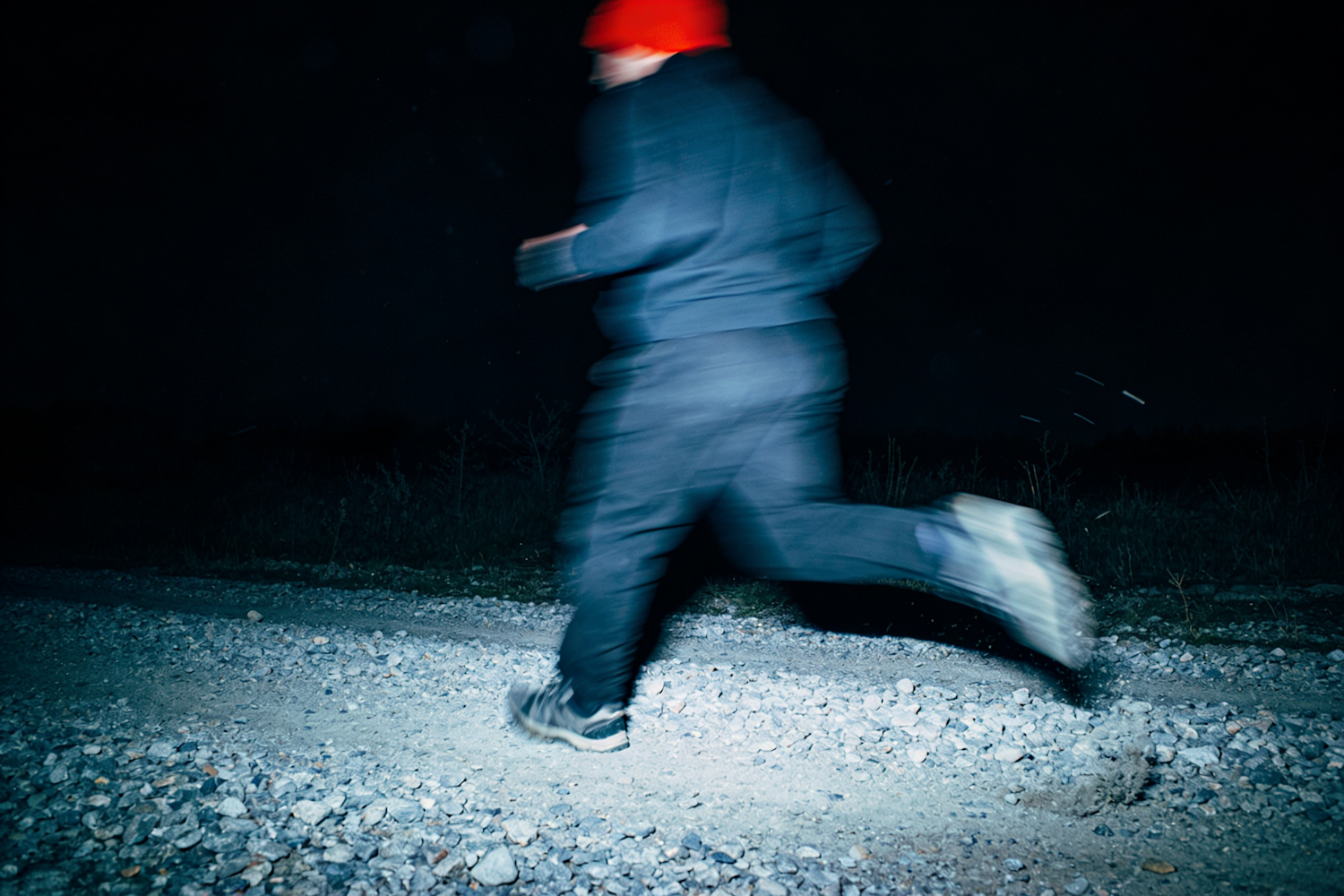 A person in dark clothing and a red hat runs on a gravel path at night, with motion blur and dramatic lighting enhancing the scene.