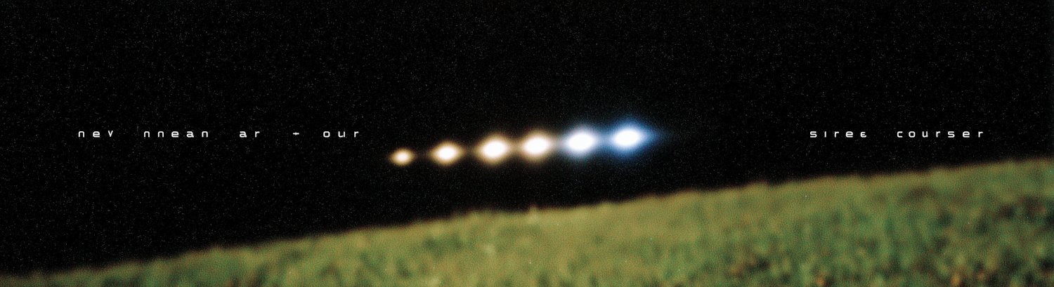 A nighttime scene with bright lights in the sky, a grassy foreground, and artistic text overlay, creating a mysterious and striking composition.