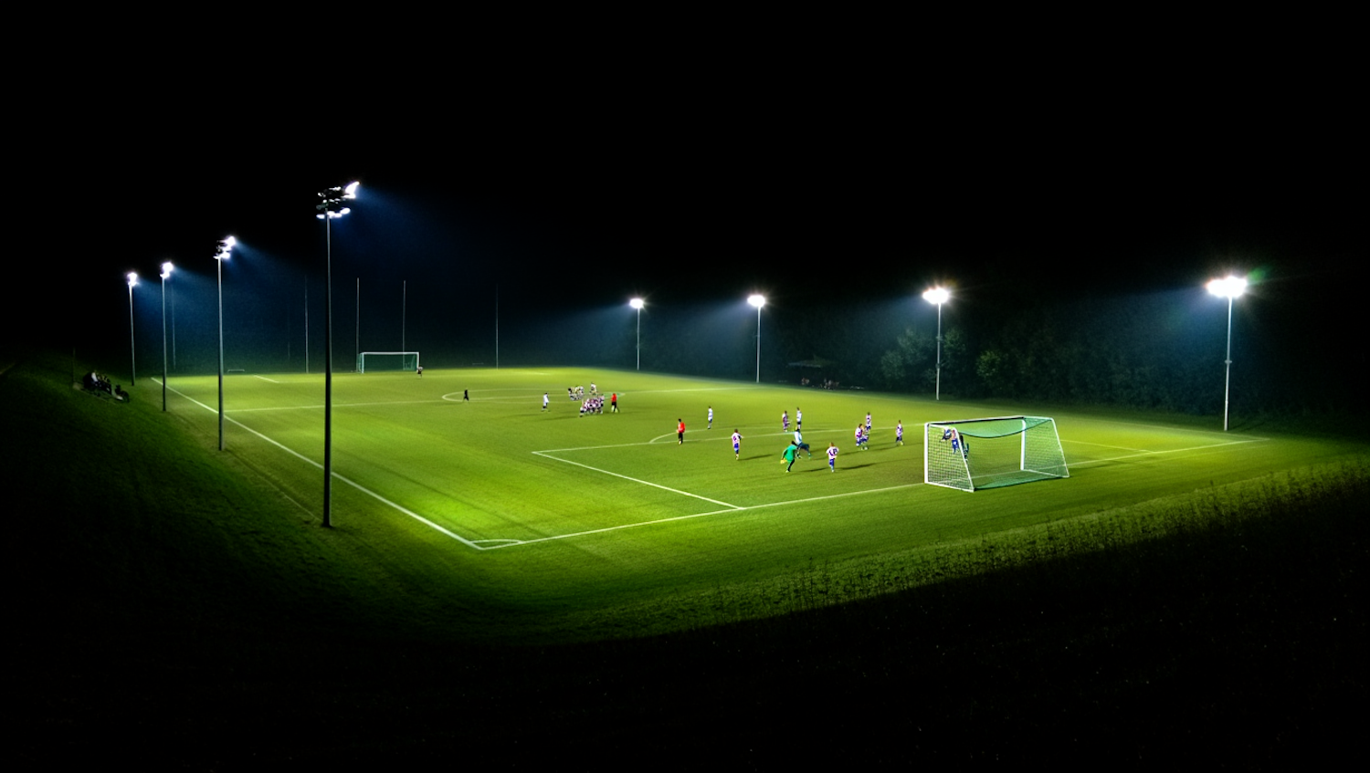 Nighttime soccer match on a floodlit field with players in action, surrounded by trees and a few spectators on a grassy slope.