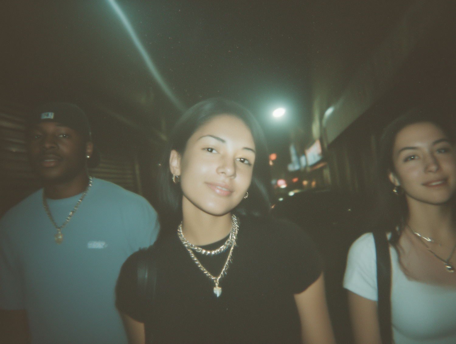 Three friends walking at night on a dimly lit street, with soft smiles and casual outfits, creating a moody urban vibe.