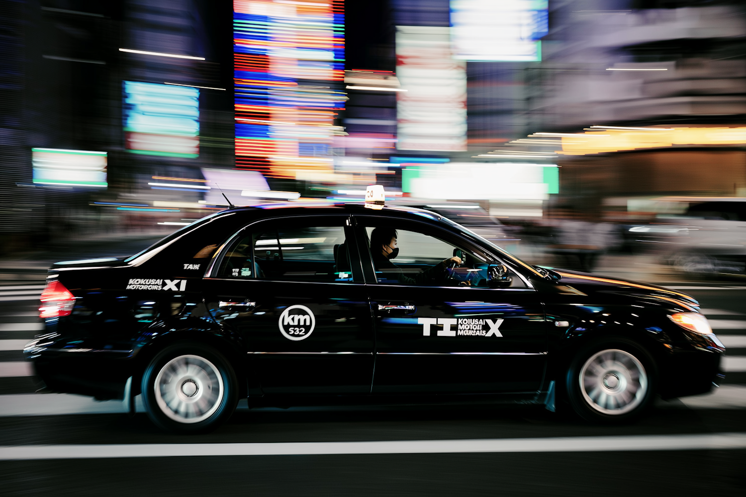 A sleek black taxi drives through a vibrant city at night, with colorful lights and motion blur creating a dynamic urban scene.
