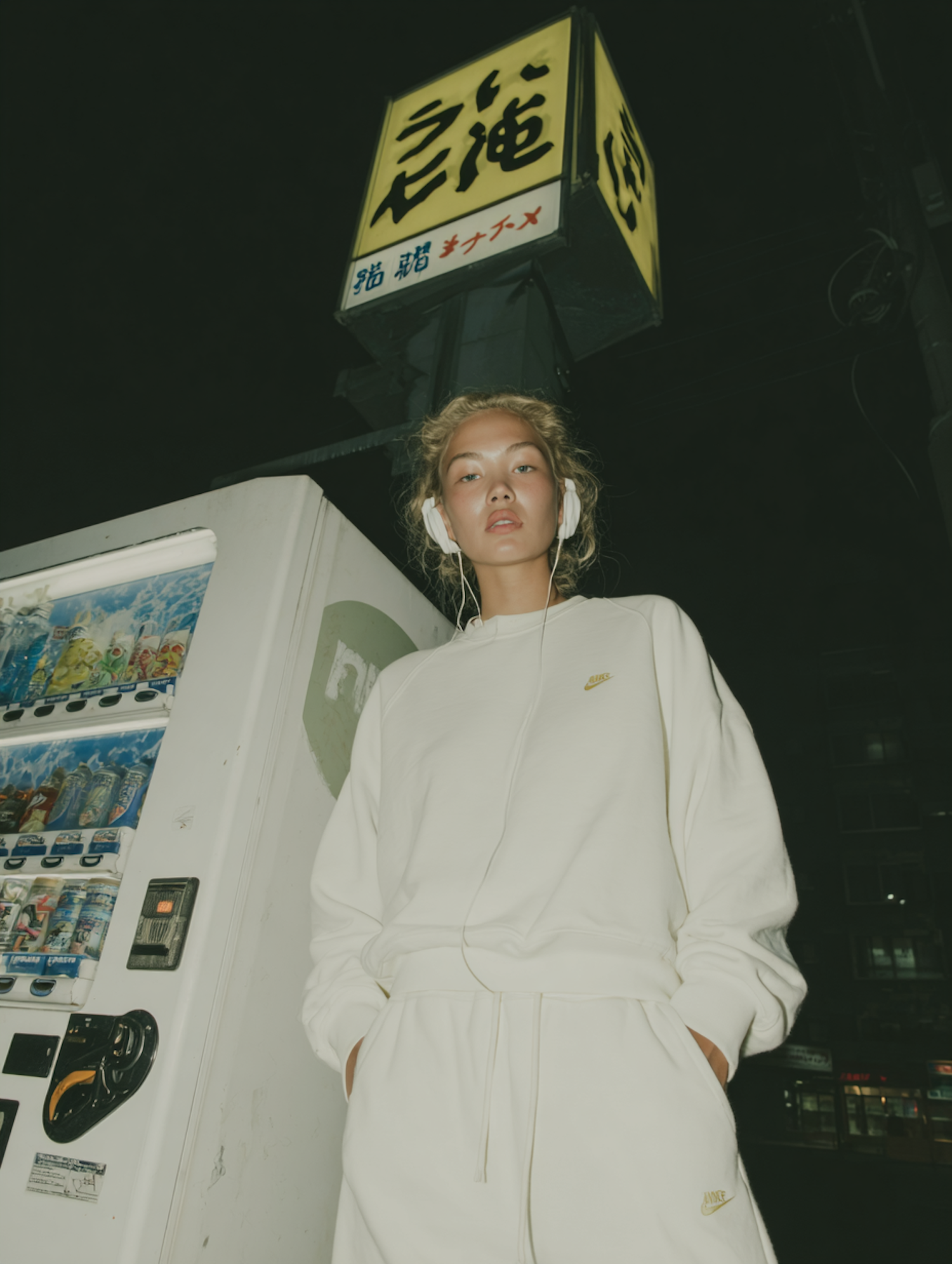 A person in a white Nike tracksuit and headphones stands by a vending machine at night, with a glowing Japanese sign above.