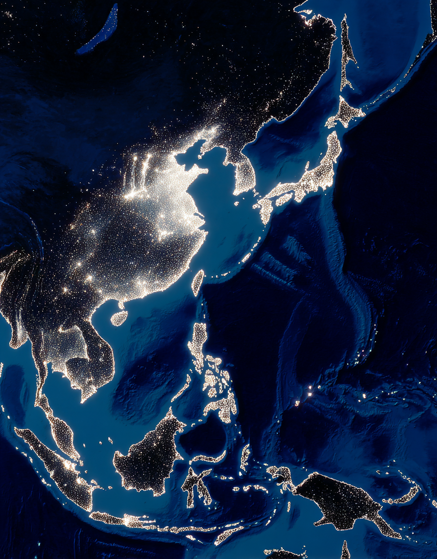Satellite view of East and Southeast Asia at night, showing illuminated cities and coastlines against dark oceans and less populated areas.