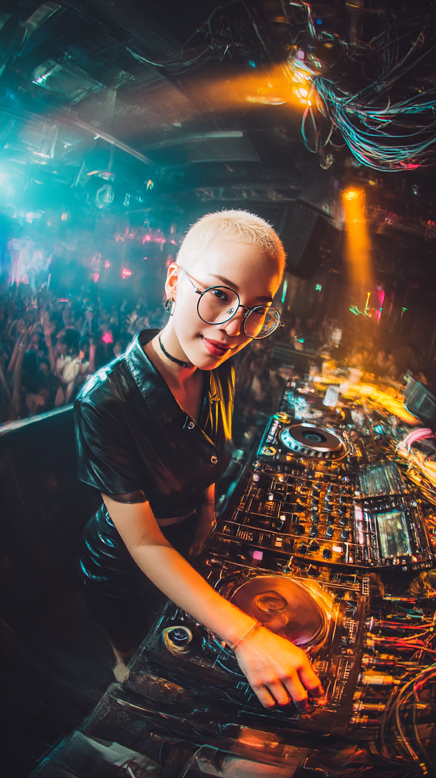 A DJ with short hair and glasses performs in a lively nightclub, surrounded by vibrant lights and an energetic crowd.