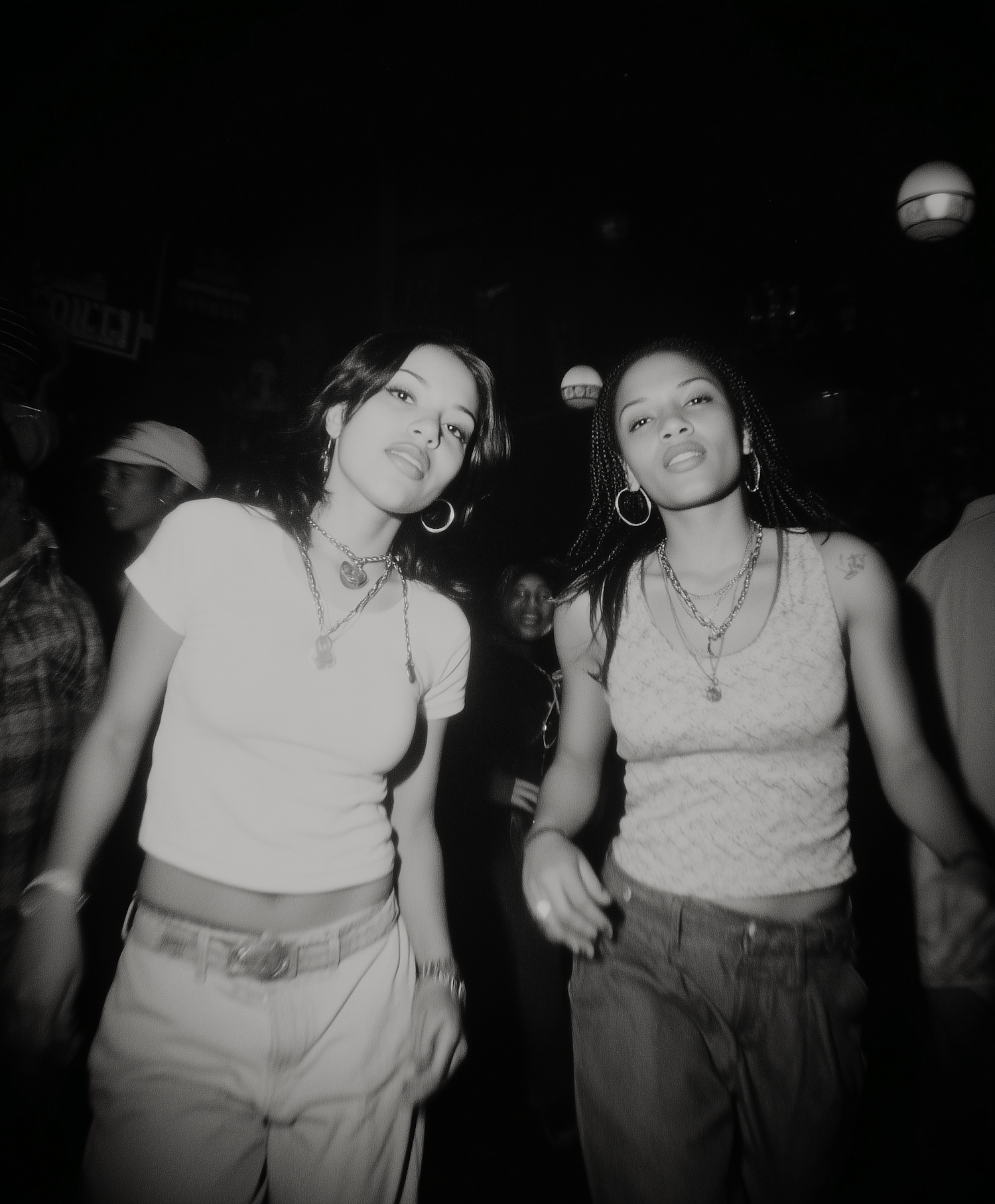 Two stylish women in casual outfits enjoying a night out, accessorized with hoop earrings and layered necklaces in a lively setting.
