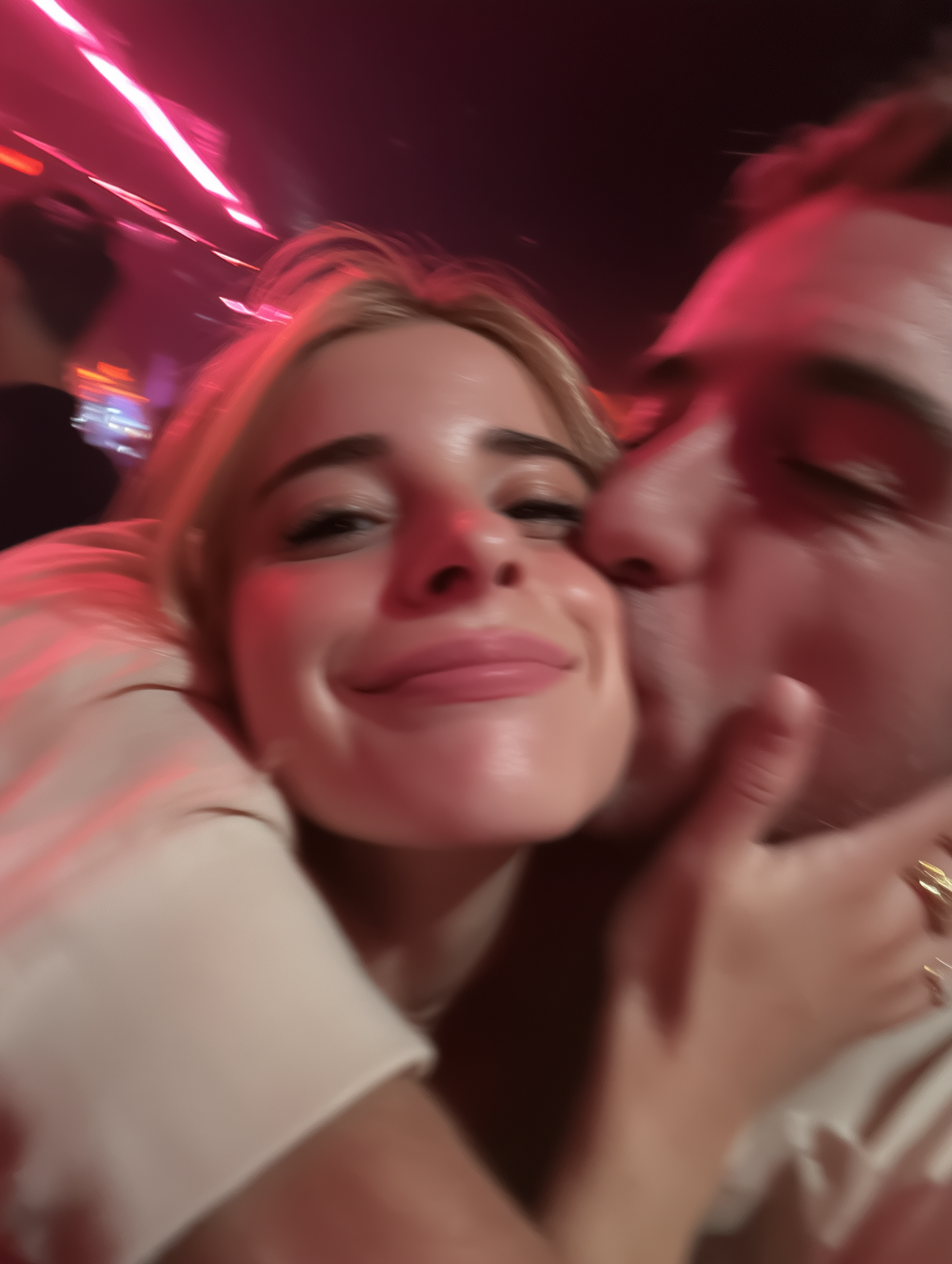 A candid moment of a couple sharing an affectionate embrace in a dimly lit, neon-lit party setting.