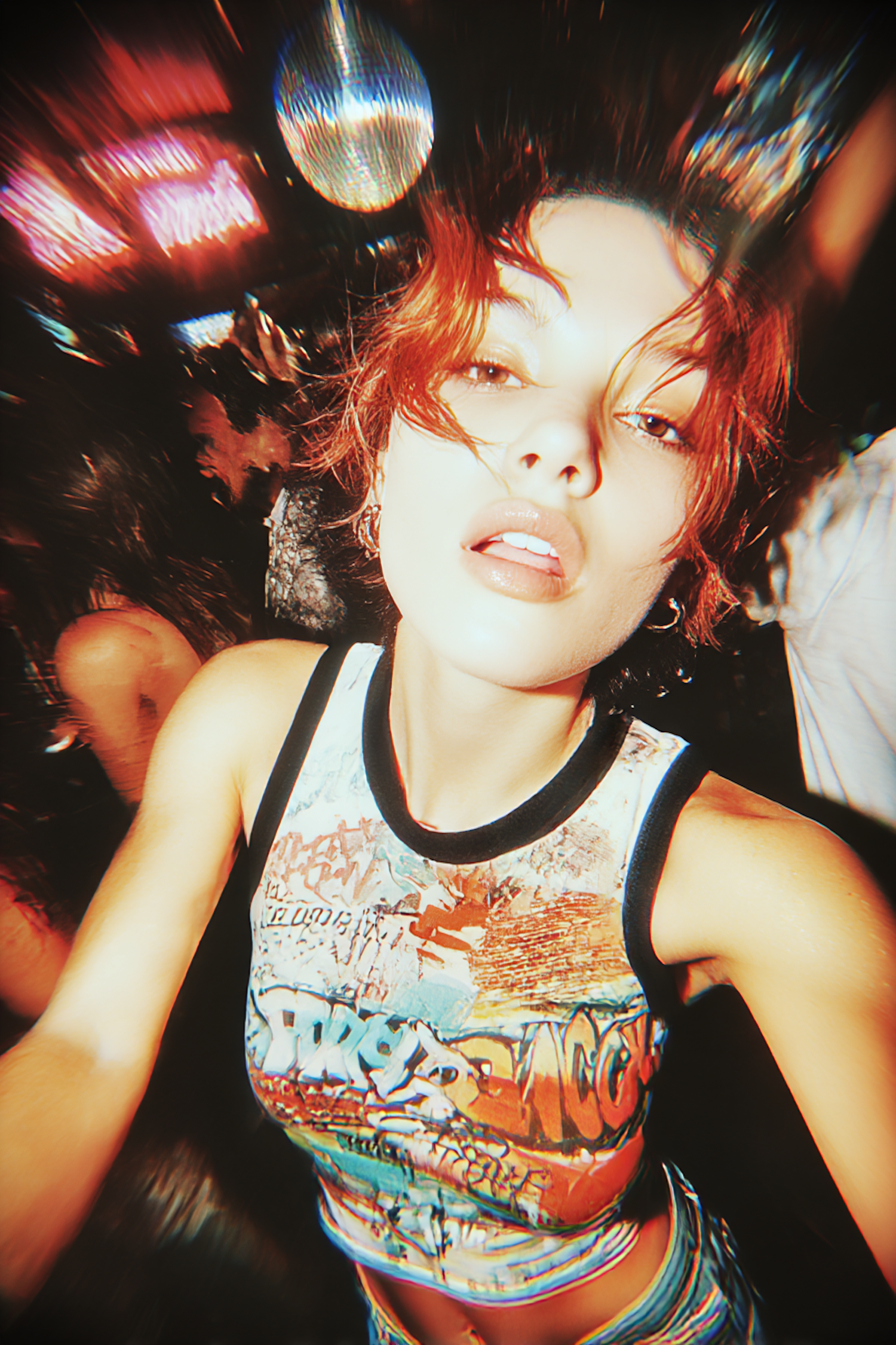 A vibrant close-up of a young woman with red hair at a lively party, wearing a graffiti-patterned crop top under colorful lights.