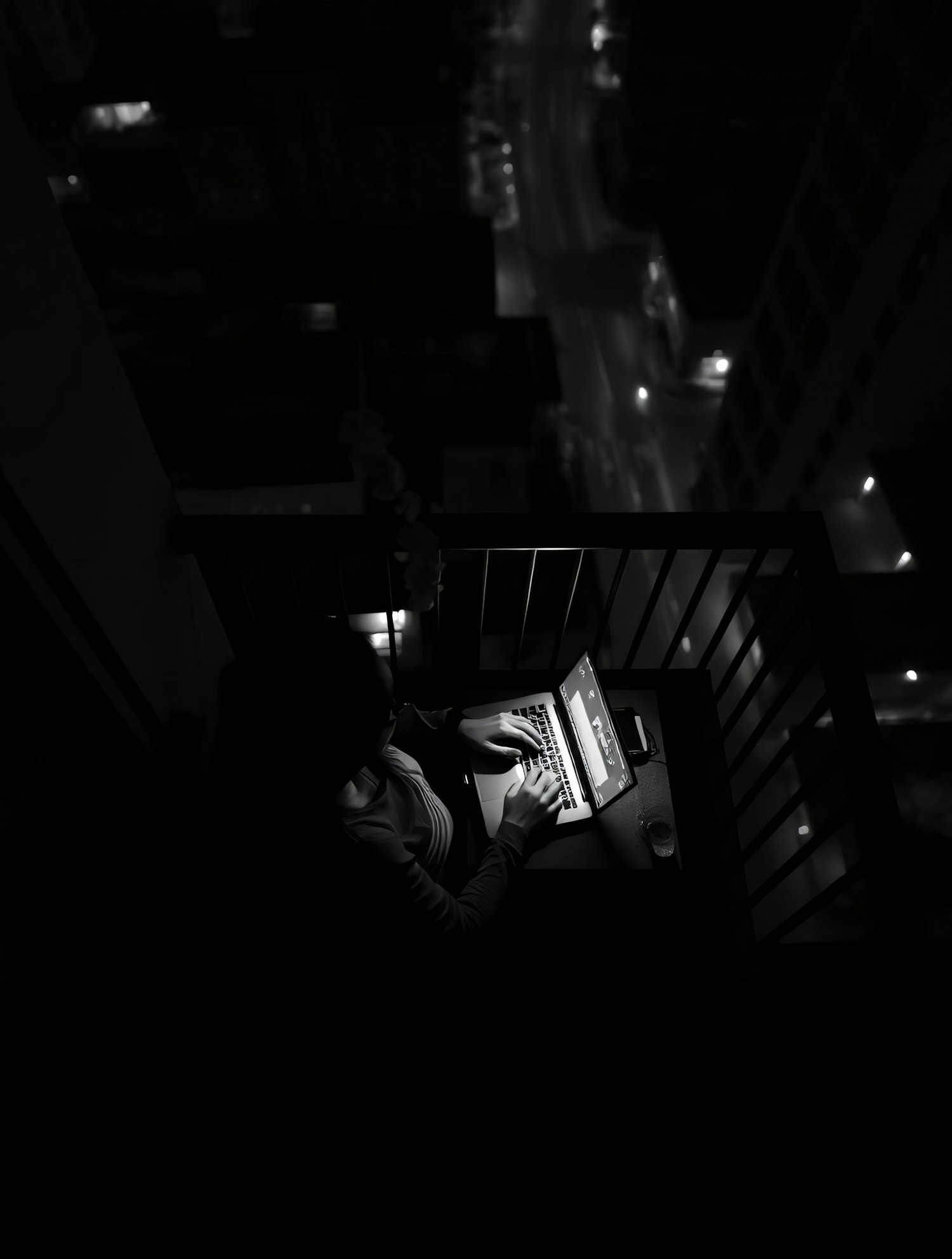 A person works on a laptop at night on a balcony, with a dimly lit cityscape in the background, captured in striking black and white.