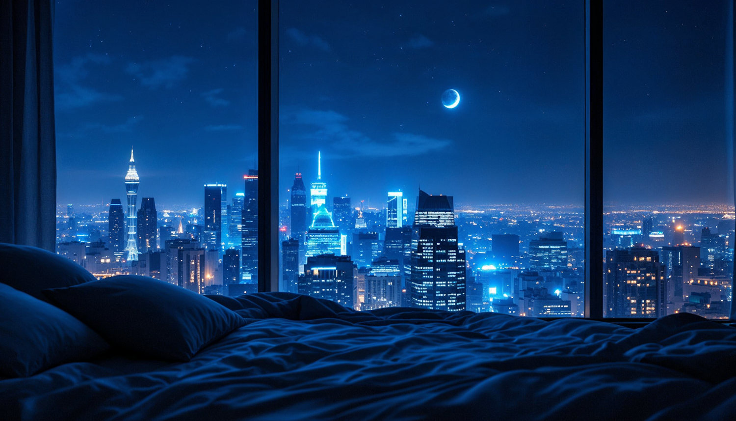 Luxurious bedroom with a stunning night view of a city skyline, featuring a crescent moon and vibrant blue hues.