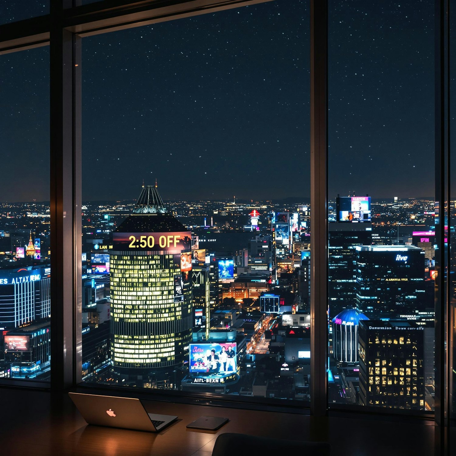 view from an half of an office on the 25th floor with glass wall that has low laptop screen light that is viewing on night city with sky of stars and some ads on the walls of the other buildings