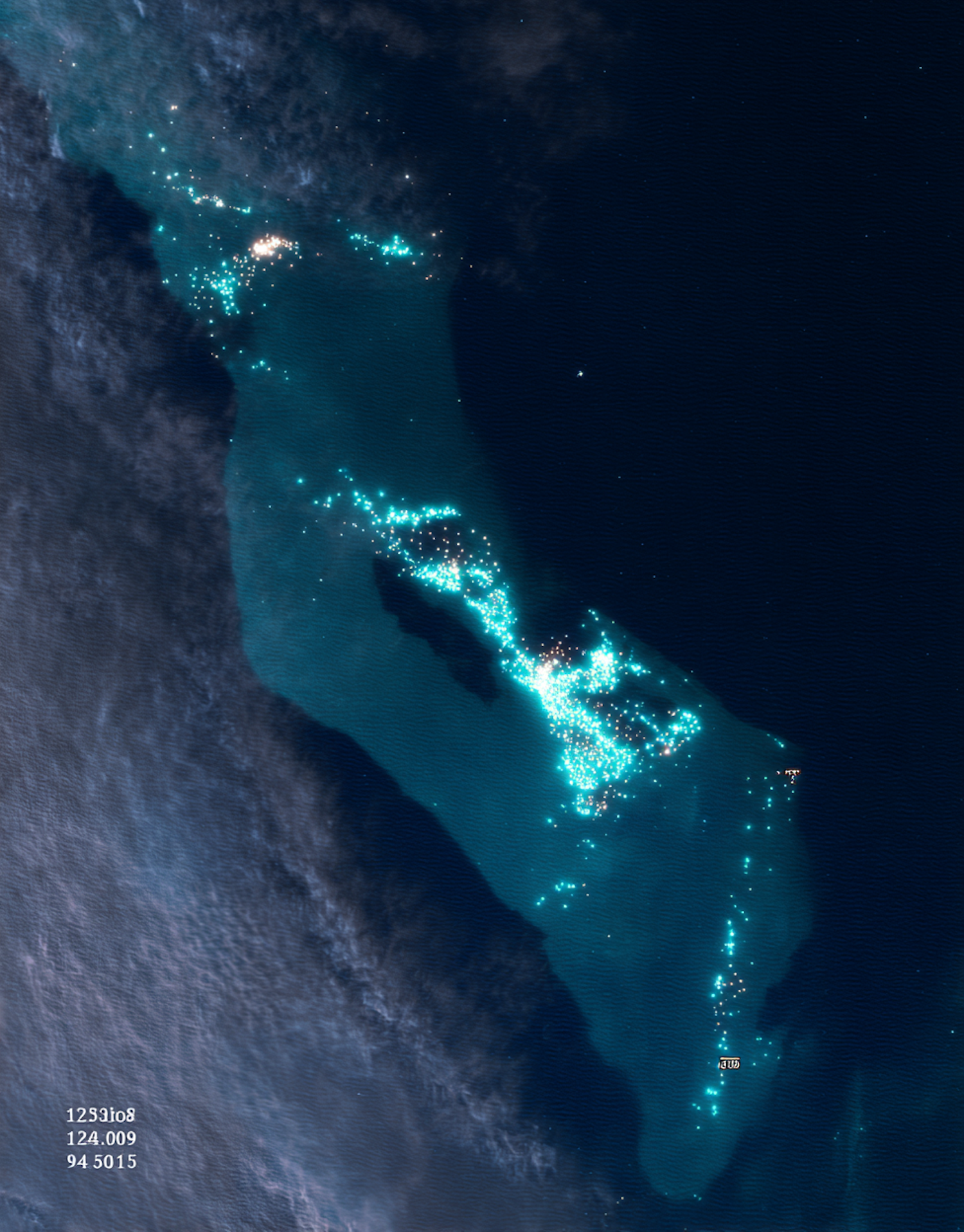 Satellite view of a coastal area at night, with bright lights scattered across the water, likely indicating fishing activity.