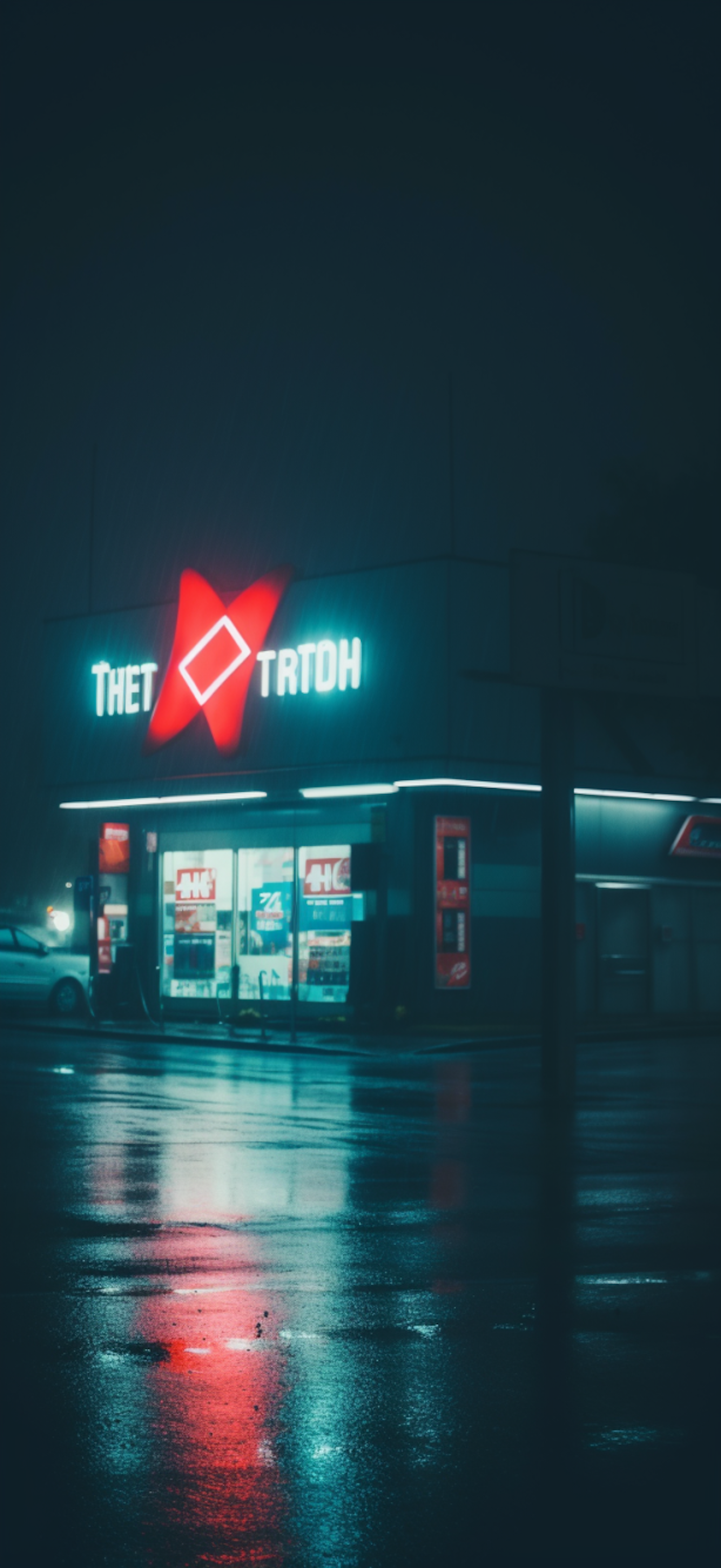 Moody night scene of a neon-lit convenience store with reflections on wet pavement, creating a cinematic atmosphere.