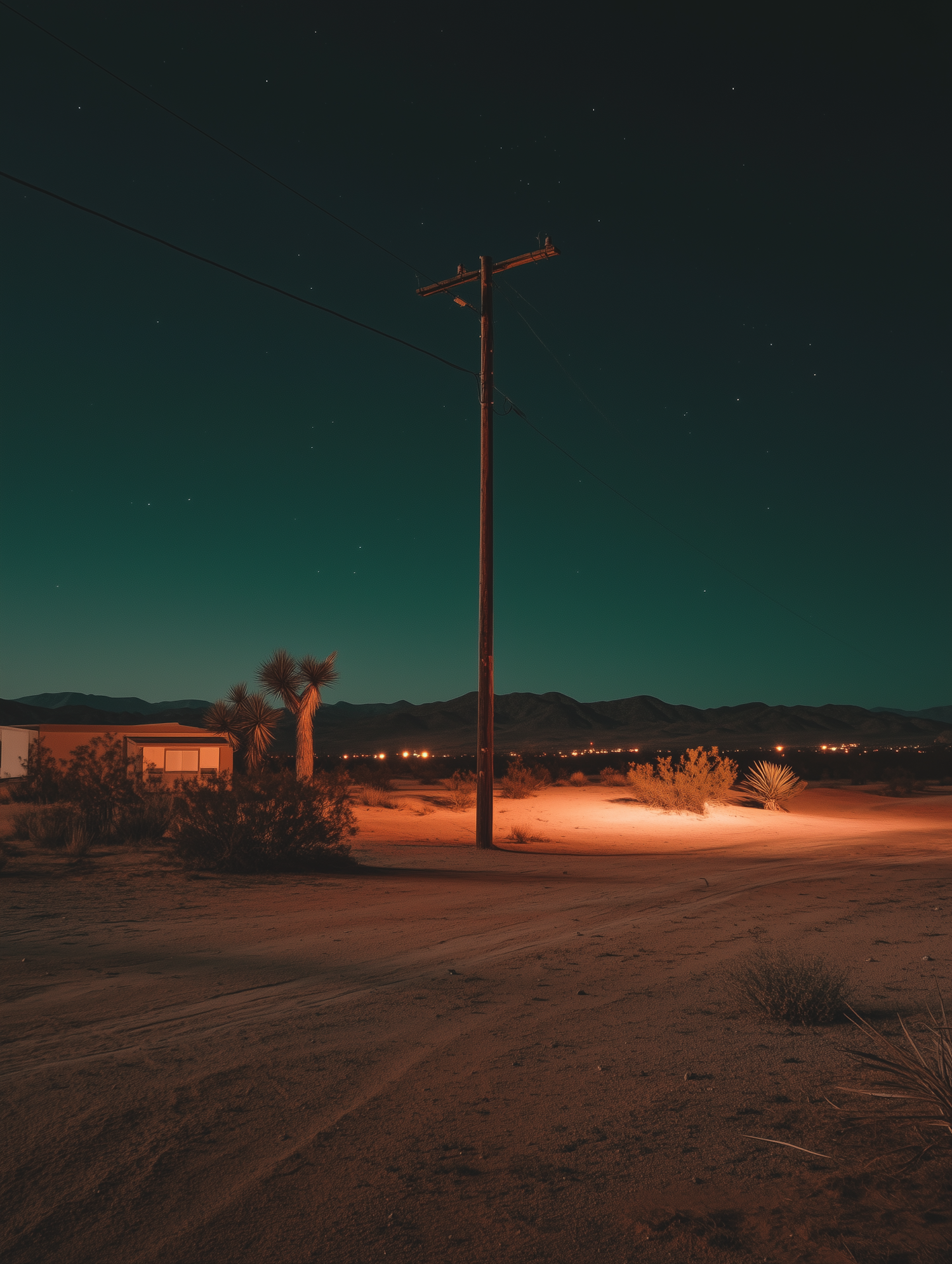 A quiet desert night with a utility pole, warm lighting, yucca plants, and distant city lights under a starry teal sky.