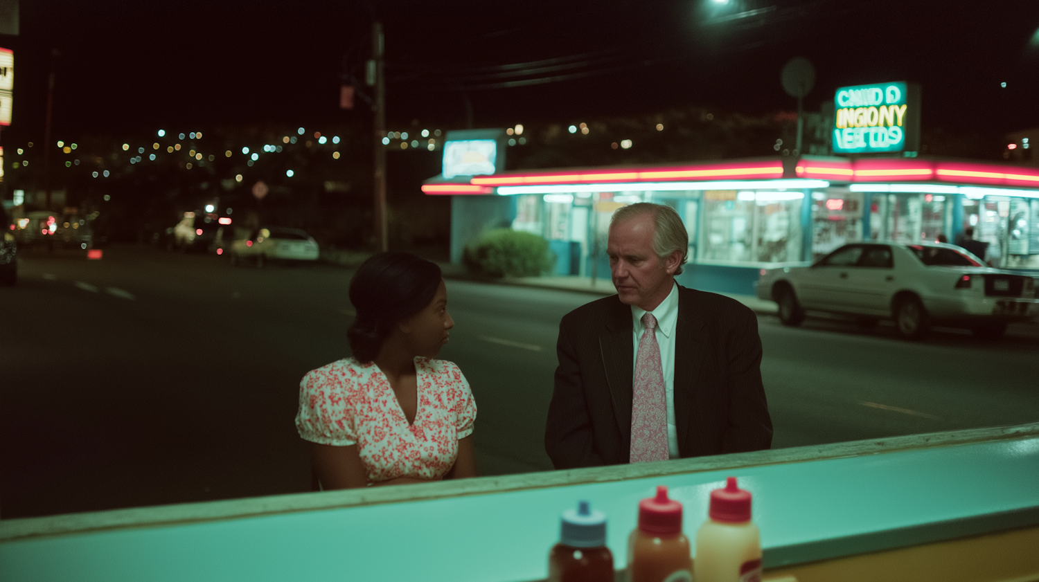 Two people converse at an outdoor counter at night, with a neon-lit diner and parked cars in the background.