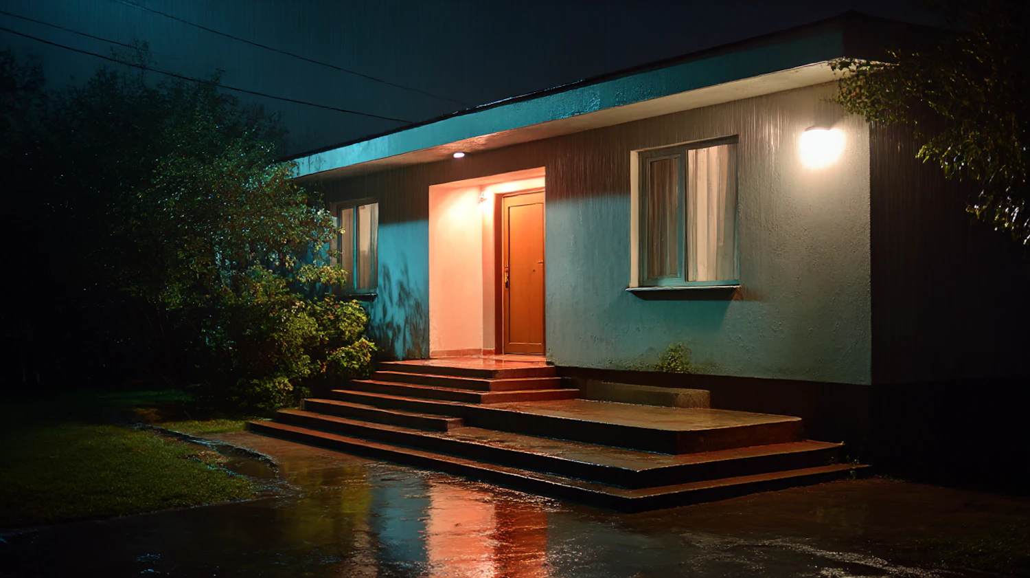 A cozy house at night with warm lights, wet steps, and surrounding greenery, creating a serene and slightly mysterious ambiance.