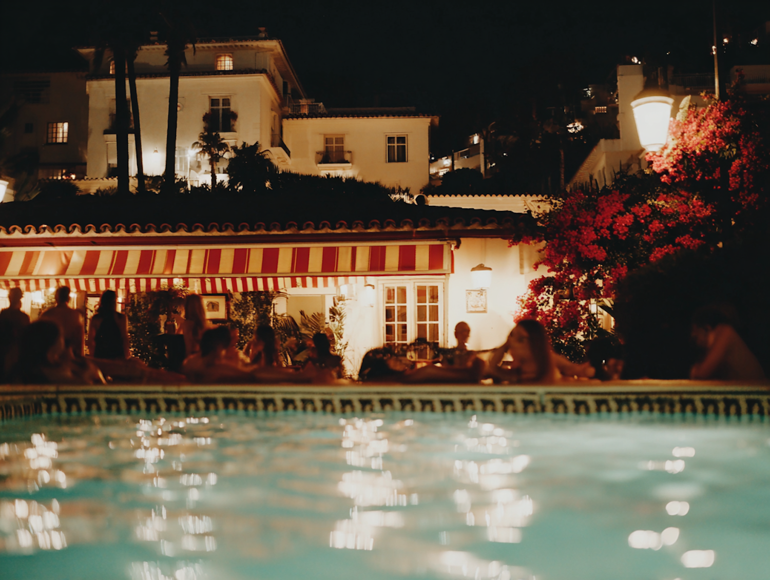 A cozy nighttime poolside gathering with warm lighting, red-striped awnings, and vibrant flowers creating a festive atmosphere.