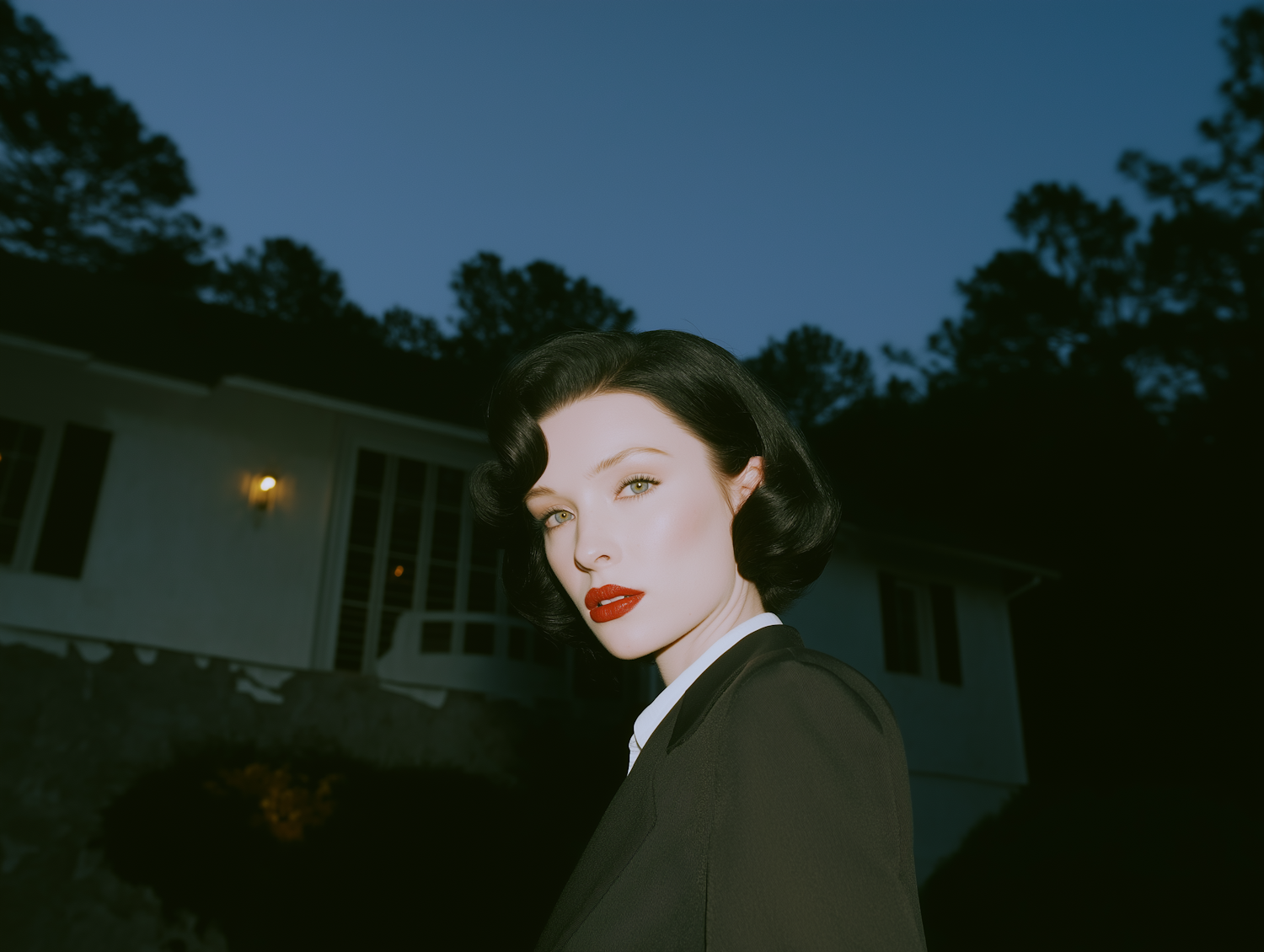 A woman with styled black hair and red lipstick stands outdoors at night, wearing a dark suit jacket and white shirt, with a house in the background.