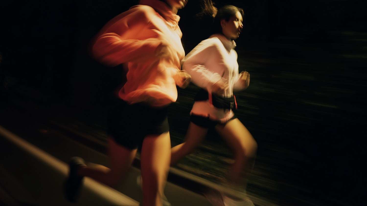Two runners in motion at night, wearing bright athletic hoodies, captured with dynamic lighting and motion blur for an energetic feel.
