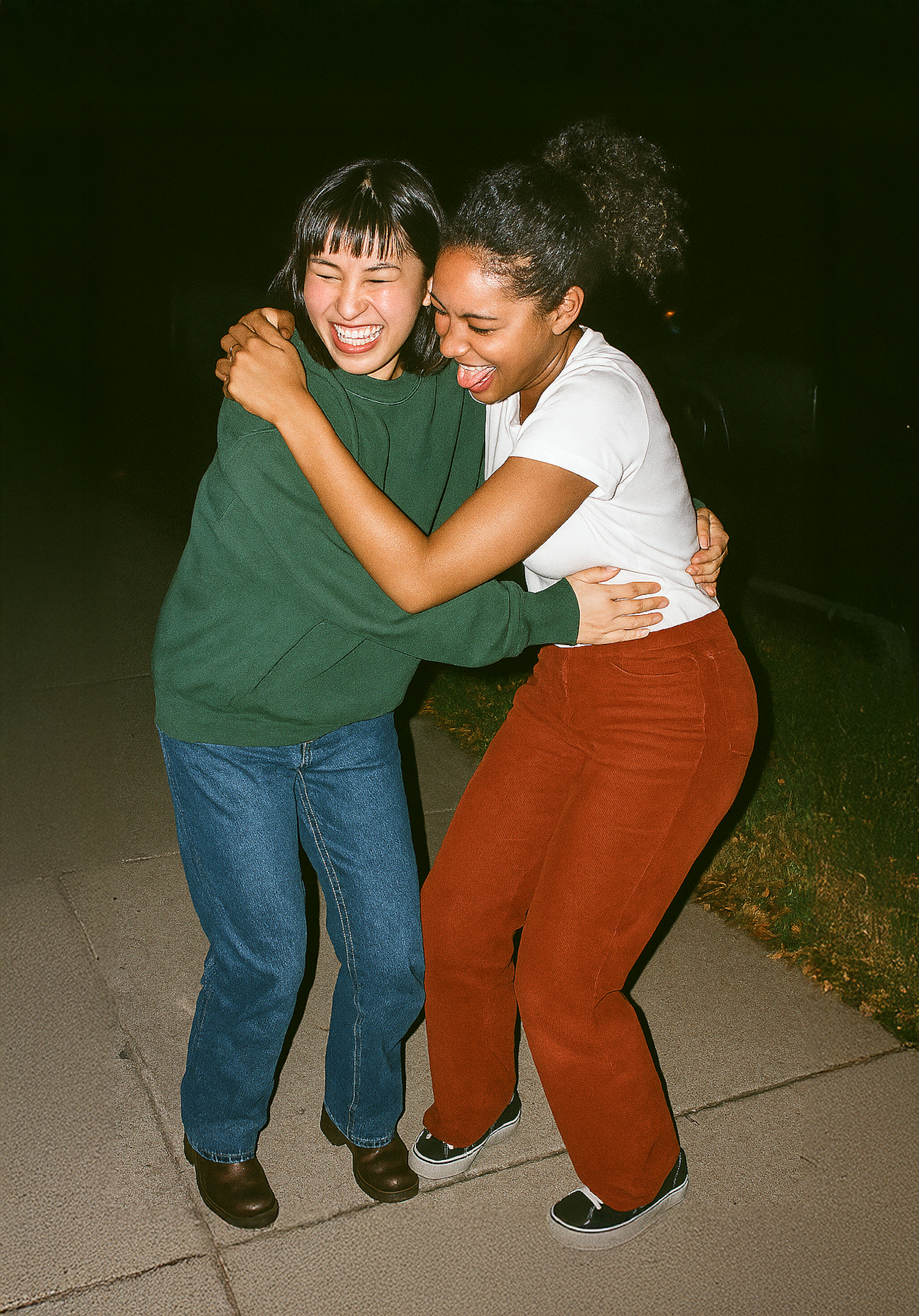 Two friends share a joyful embrace and laugh together on a nighttime sidewalk, dressed casually in jeans and vibrant colors.